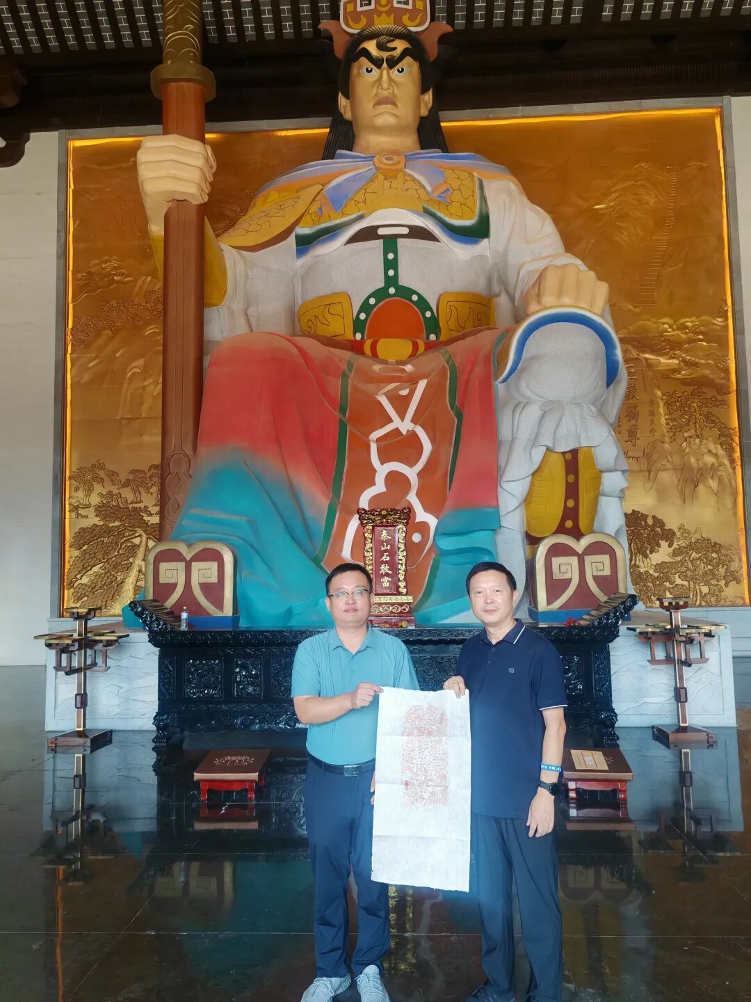 在泰山石敢当景区敢当殿内,泰山石敢当民俗文化专家李船五先生指尖划过遍布地图的石敢当标记:或刻字镇宅,或雕狮踞守,或嵌入墙基,或矗立街口。它们如同被风卷起的种子,撒向四方,甚至远渡重洋,在异乡的土地上顽强生根。“每个中国人心中都住着一位泰山石敢当”,李船五先生语调平和,却道破民间信仰那流动不息的生命真谛,“只要有人烟处,它便寻得了安身立命的所在。”临别,他赠我一幅朱砂拓片。浓重的朱色深深拓着四个筋骨嶙峋的大字:“泰者敢当”。笔画像断崖峭壁,每一痕都镌刻着凛然不可犯的尊严,那刀锋游走于石上的轨迹,仿佛凝滞了生与死的界限,令人屏息。