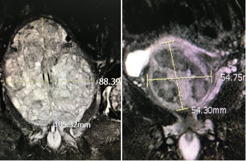 图:通过栓塞增生部分萎缩(图为栓塞前和栓塞后一个月的对比)
