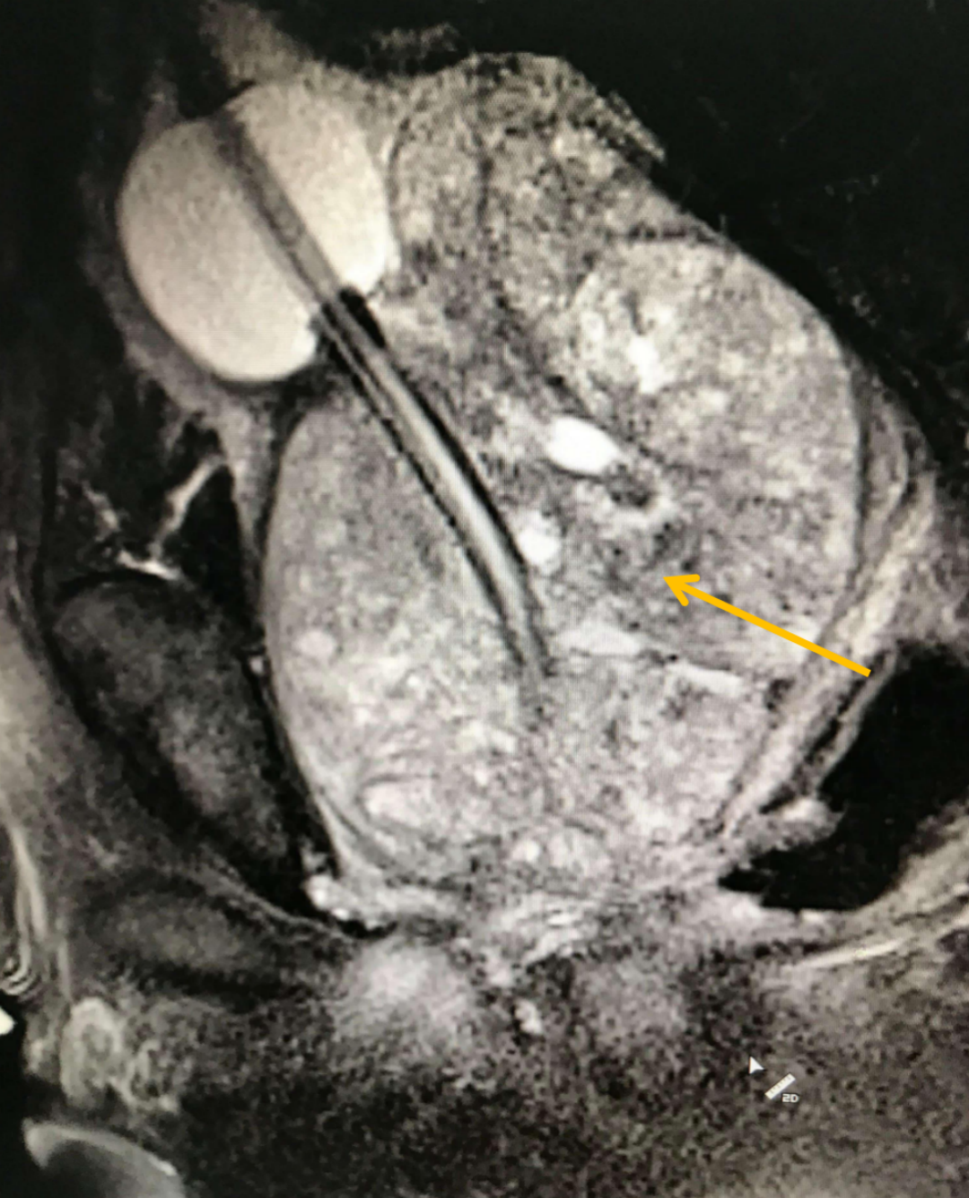 图:增生的前列腺(箭头所指)挤压尿道,导致排尿困难