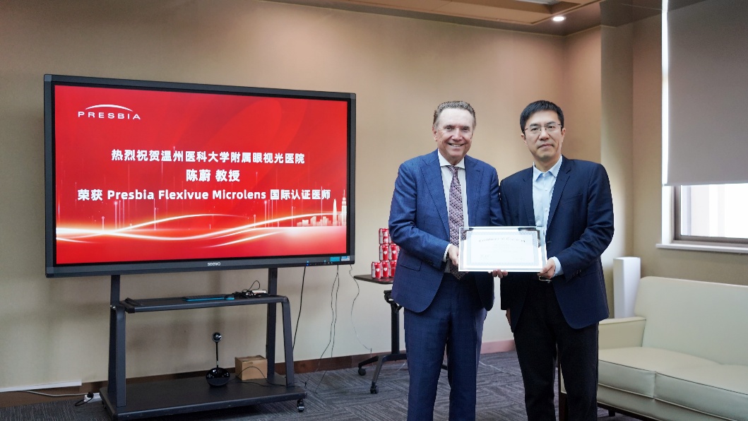 近日,Presbia首席科学家VladimirFeingold博士专程到访温州医科大学附属眼视光医院,为陈蔚教授颁发“PresbiaFlexivueMicrolens国际认证医师”(FM微透镜老视矫正)证书,标志着认可陈蔚教授在“老视矫正领域”临床应用专业技能和能力,已具备全球领先水平。