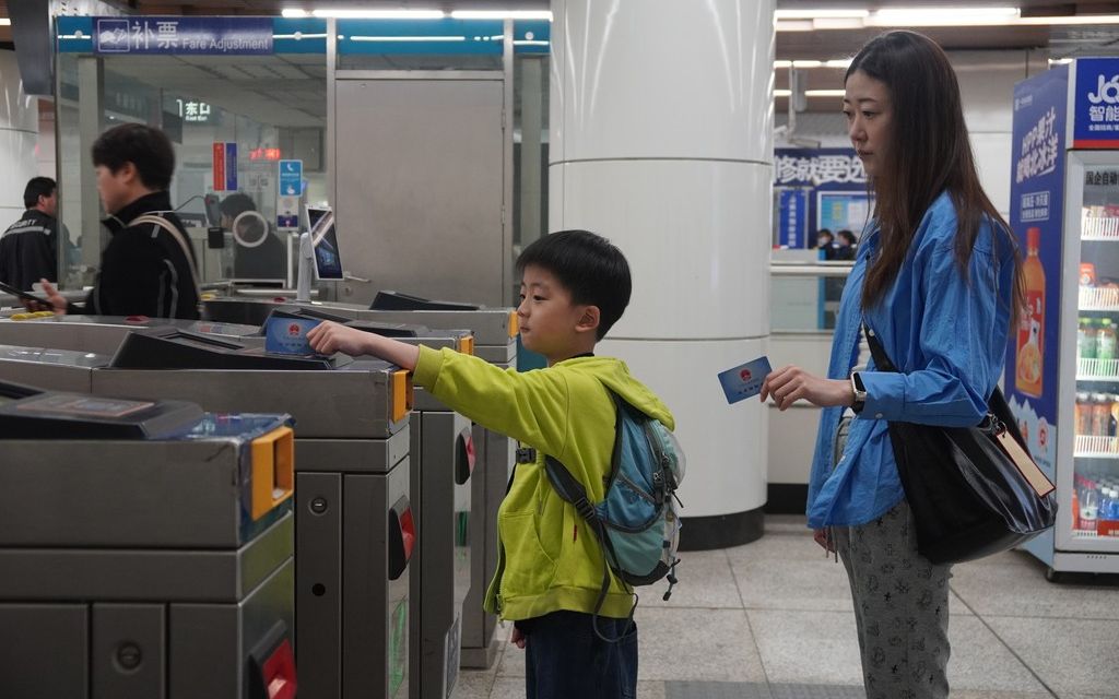 5月1日,在北京地铁7号线进站口,河北省保定市民范芮洁(右)和儿子掏出各自的社保卡,将其贴在闸机感应区,顺利乘坐北京的地铁。保定市人社局 供图