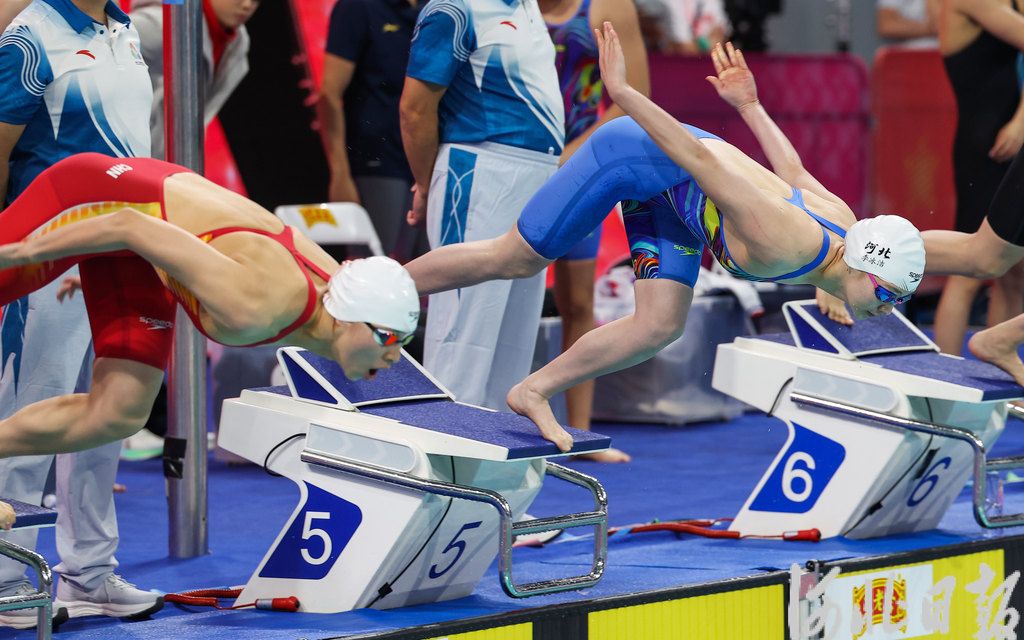 11月10日,河北选手李冰洁(右)在接力赛中。当日,中华人民共和国第十五届运动会游泳比赛在深圳大运中心游泳馆举行。在女子4×100米自由泳接力决赛中,由李冰洁、刘子璇、于子迪、赵静蕾组成的河北队获得铜牌。 河北日报记者 耿辉 摄