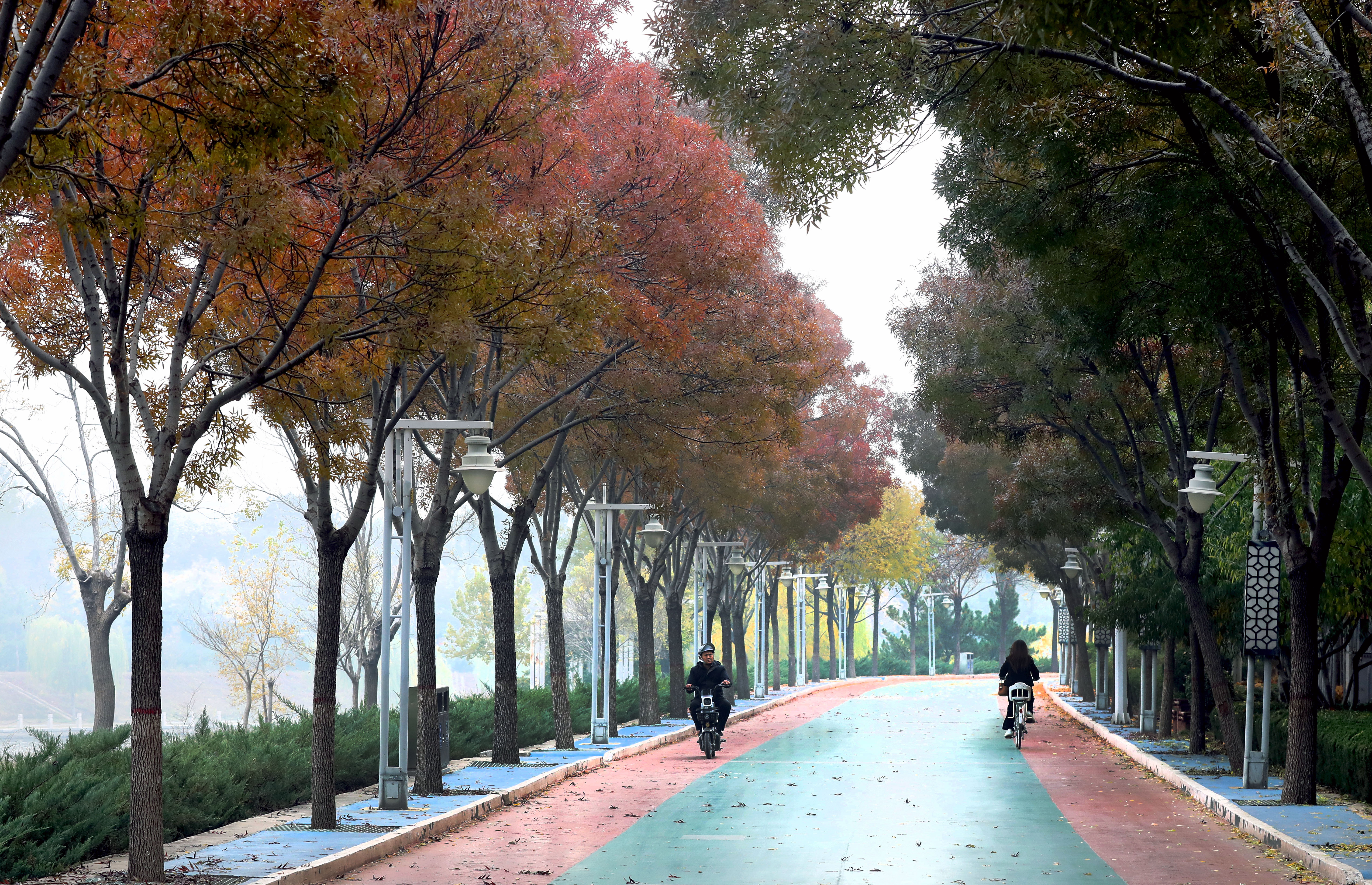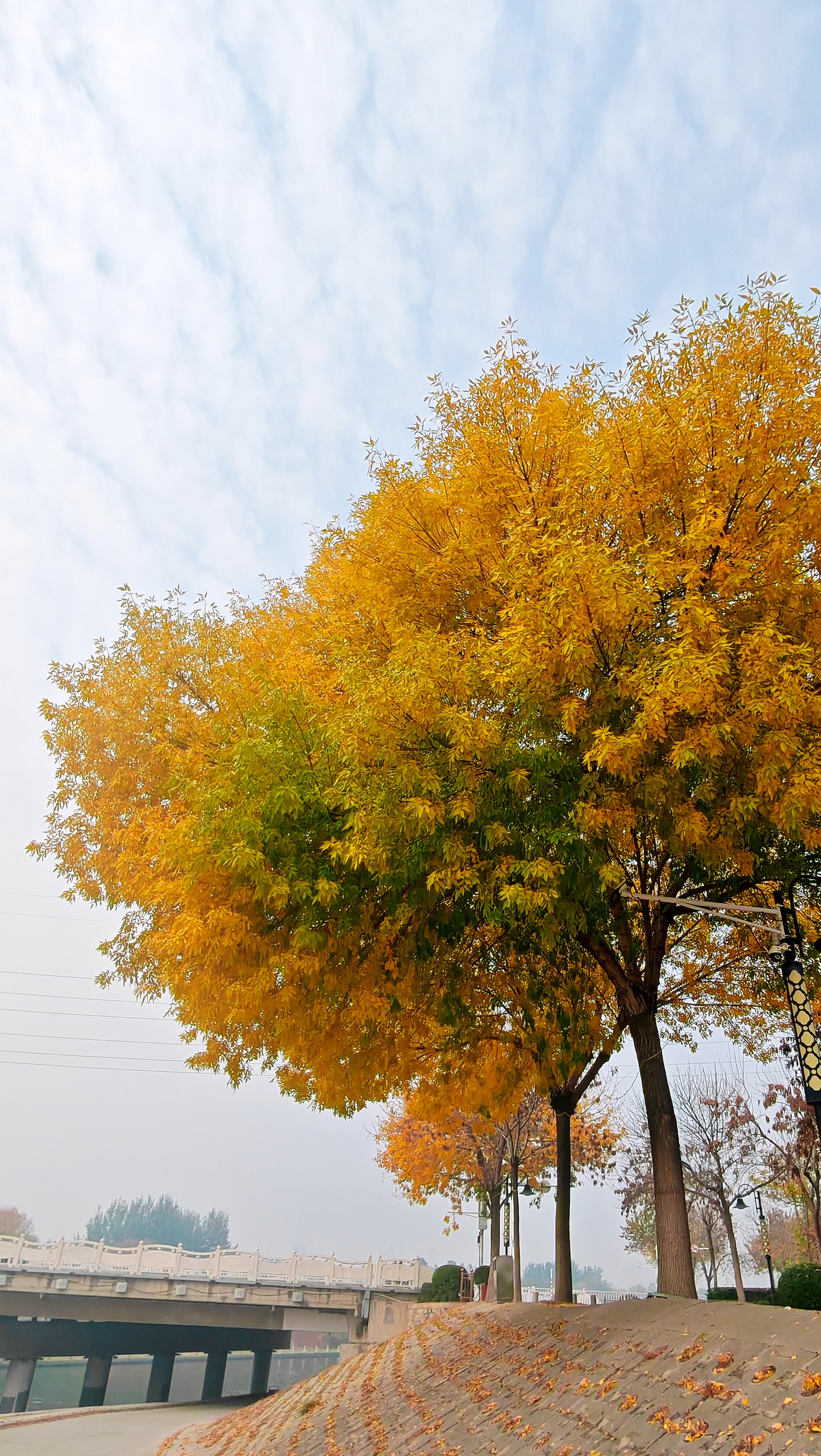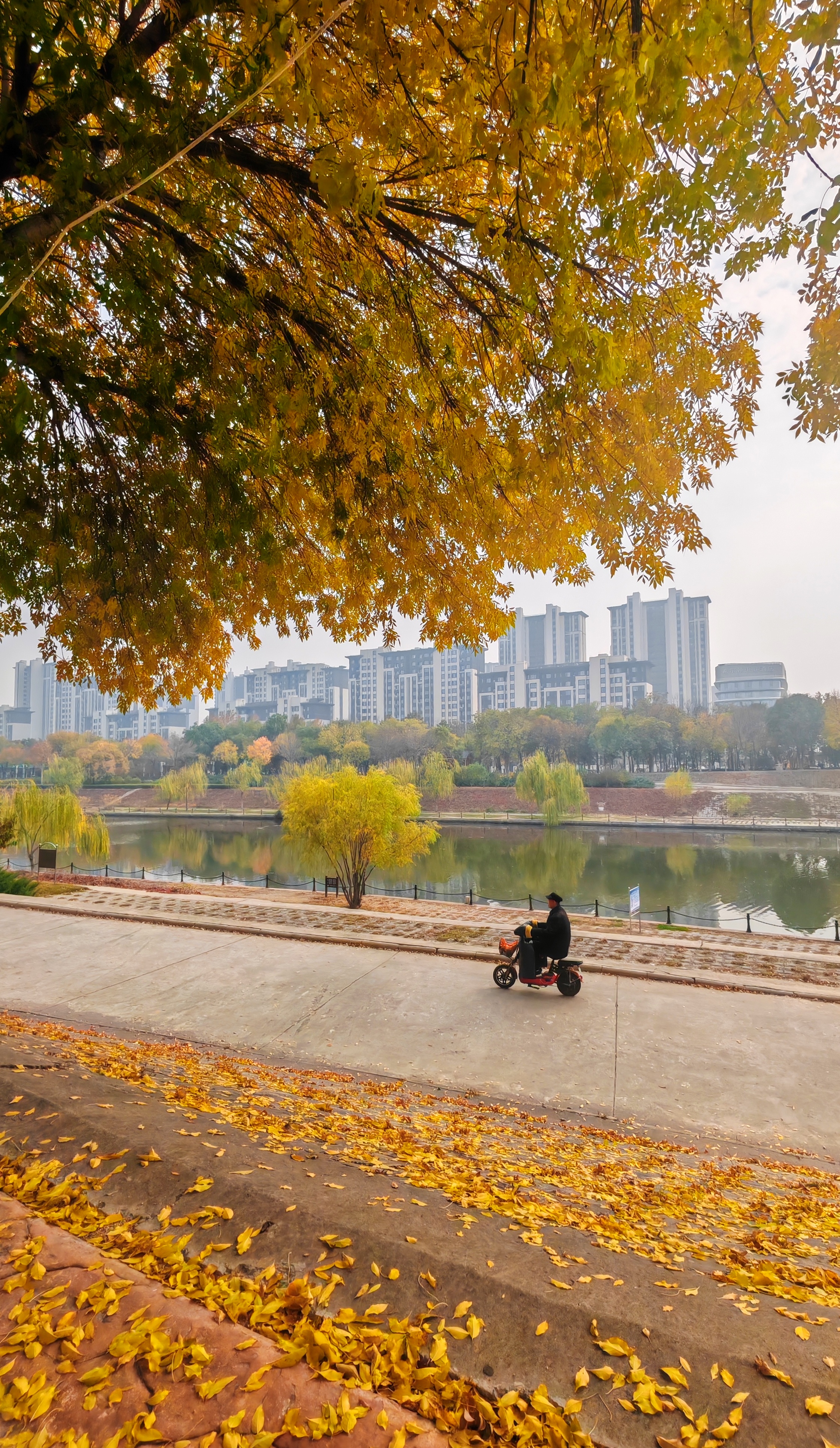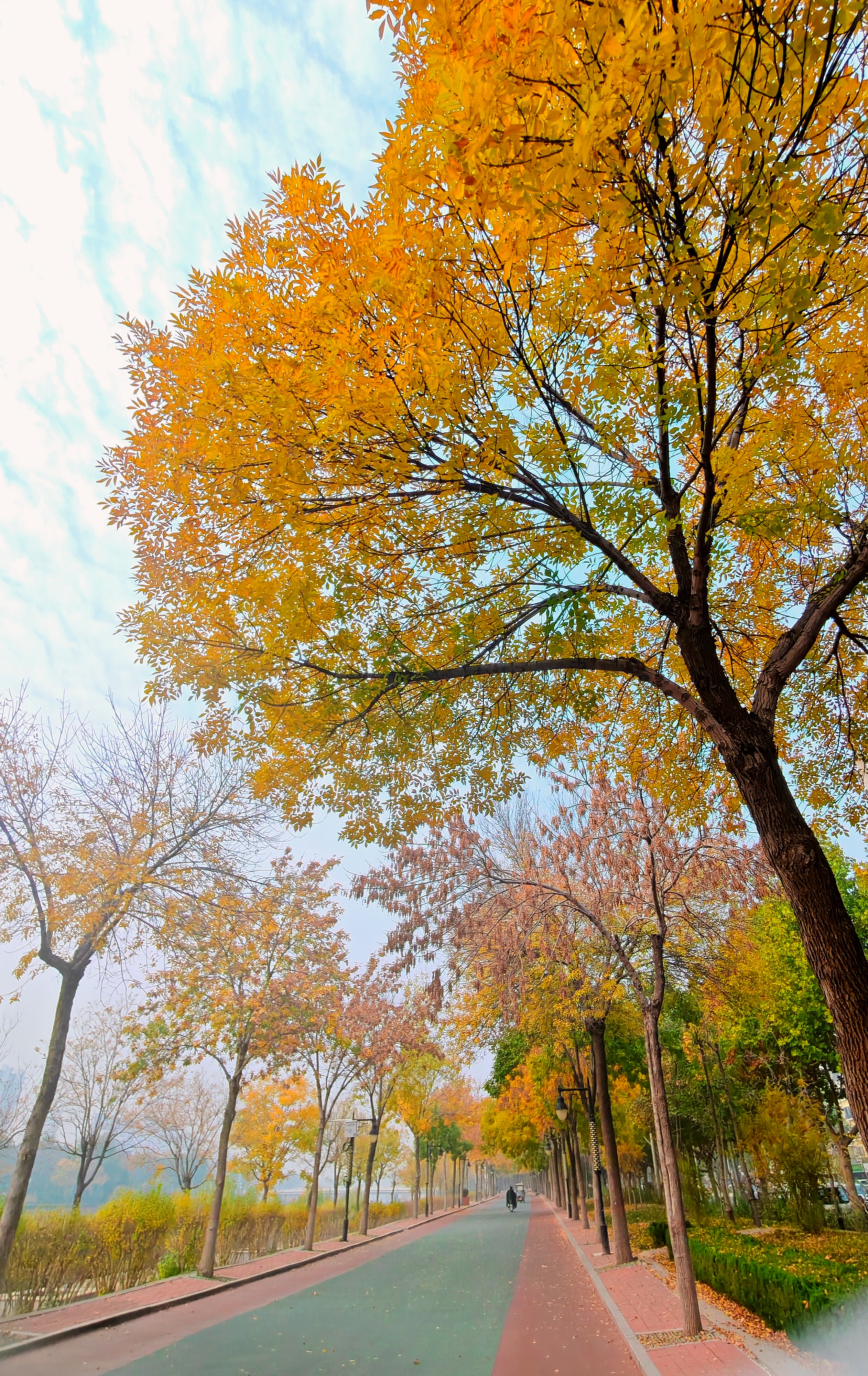 冬意初显,秋色未央。滏阳河畔健步路两侧,银杏正洒下碎金,枫树已燃起霞光,与白蜡树明艳的红黄交错成一片。漫步其间,仿佛行走在流动的油画里,每一步都踏在季节交替的韵律上。这片斑斓将冬的静谧与秋的热烈完美相融,绘就成了十一月最动人的画卷。