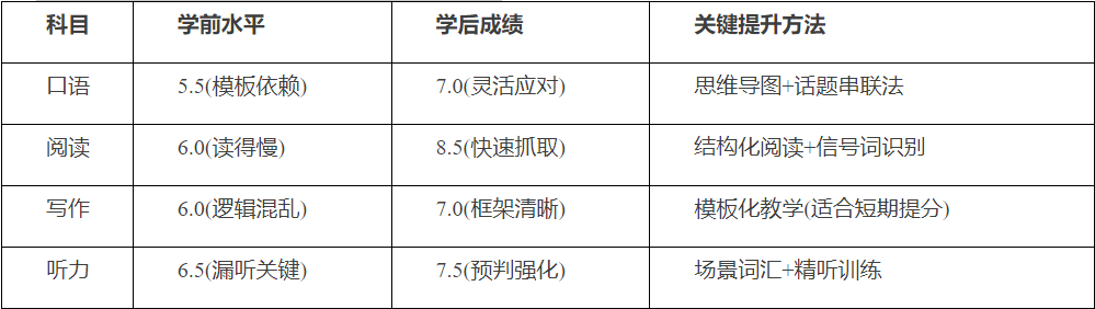 说说我的情况:考了三次雅思,最后跟着老师学了仨月,总分冲到7.5(听力7.5、阅读8.5、写作7.0、口语7.0)。之前自己瞎琢磨,也报过其他班,成绩一直卡在6~6.5分。
