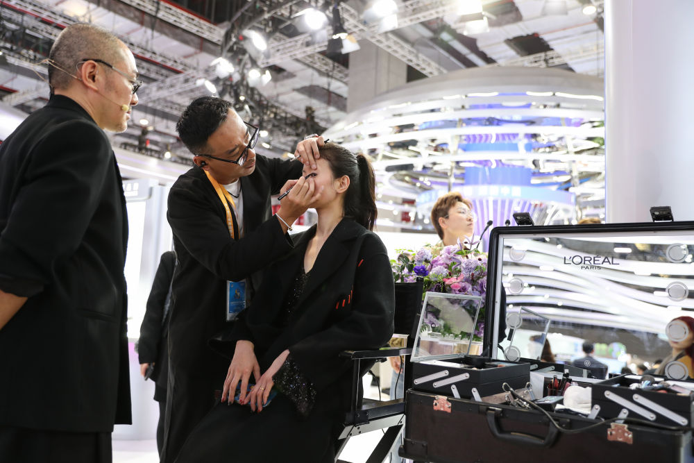 2025年11月7日,观众在第八届进博会消费品展区欧莱雅展台体验美妆服务。欧莱雅是进博会八届“全勤生”。本届进博会共有170家企业和27家机构成为签约参展的八年“全勤生”,进博会“全勤生”们的参会热情印证了中国持续推动高水平对外开放的坚定姿态,也彰显了中国为各国企业提供共享中国市场宝贵机遇的诚意。