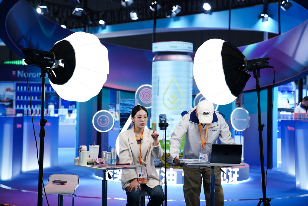 2025年11月4日,工作人员在第八届进博会医疗器械及医药保健展区直播。本届进博会直播密度大、形式多样,有的展位专门搭建直播区域,灯光、背景、展板一应俱全;有的展位手机一架、产品一摆,直播就地开始;还有的直播间是“流动的”,达人主播们拿着手机、别着麦克风,穿梭于各个品牌展位间现场推荐……八年来,进博会影响力逐年递增,越来越多的中国消费者愿意通过直播了解进博会上的“全球好物”。