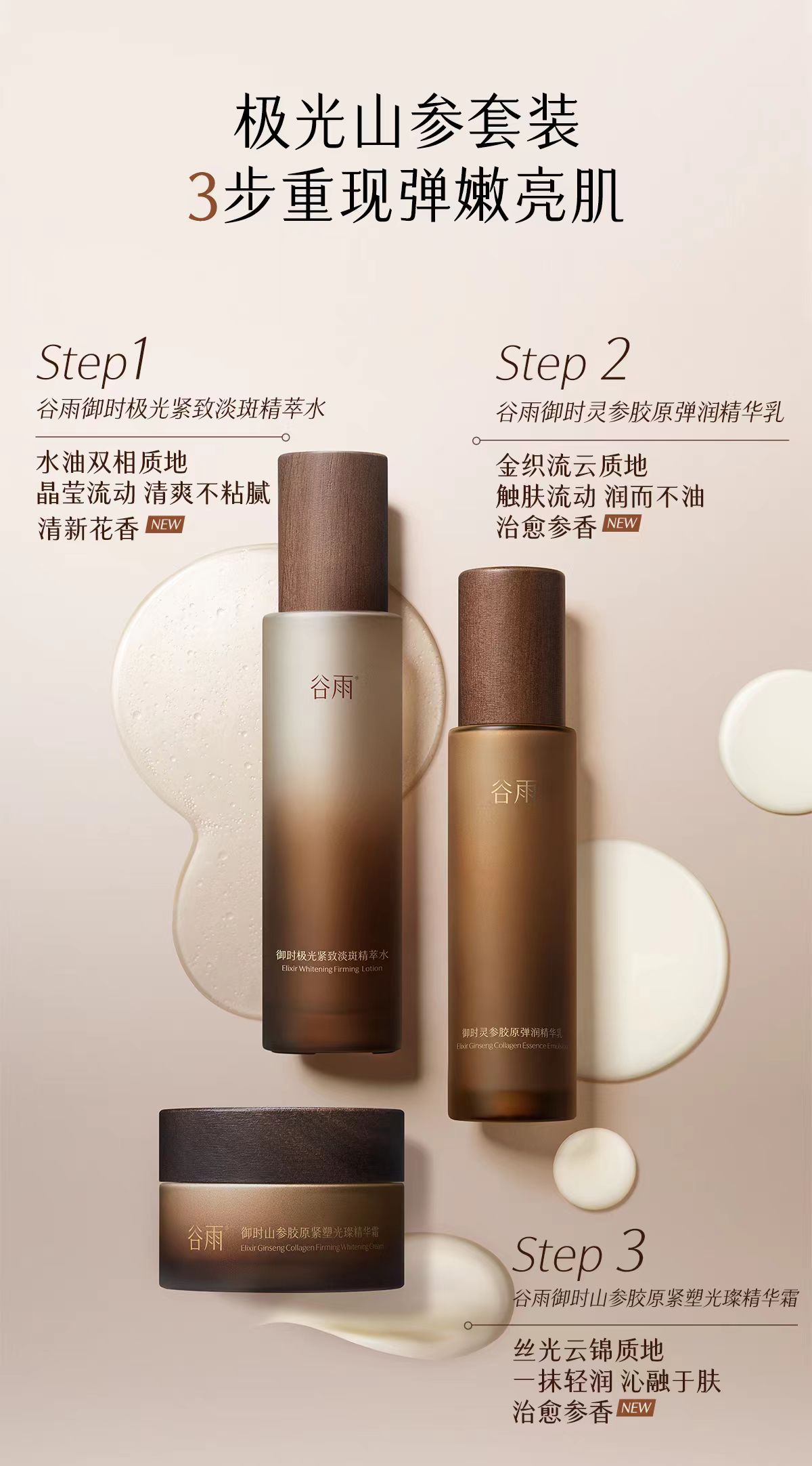 谷雨山参套装提供了「三步紧嫩白」的完整方案:
