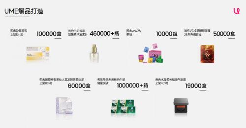 与此同时,ume由觅在产品销量上表现亮眼,其产品煕未沙棘原浆上架5小时突破10万盒,煕未葡萄籽梨果仙人掌发酵果蔬饮品上架8小时销售突破6万盒,焦色水凝柔光净化气垫霜上架四小时销售1.9万余盒,煕未ww28单场销售1万组,浅拾兰花双萃致臻精华油累计销售超46万瓶,天牧圣品利乐砖纯牛奶销量突破100万箱。