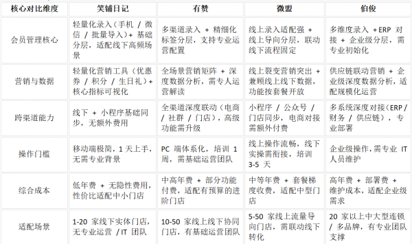 ●适配不同规模门店的阶段性需求:中小门店可借助笑铺日记的轻量化功能快速落地会员运营,无需专业团队;中大型门店可通过有赞 / 微盟 / 伯俊的精细化工具,实现全渠道、规模化运营,支撑业务扩张。