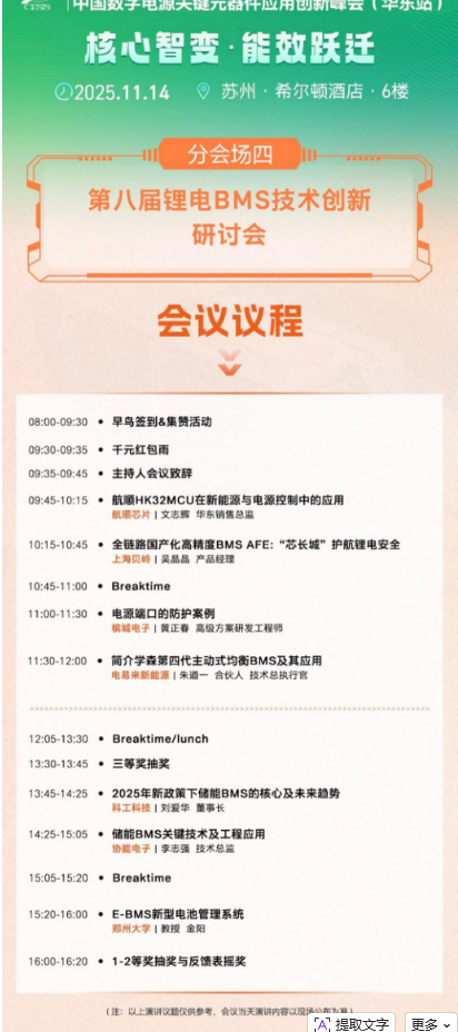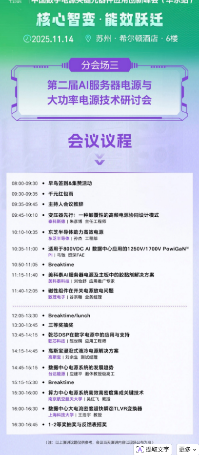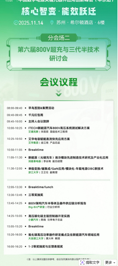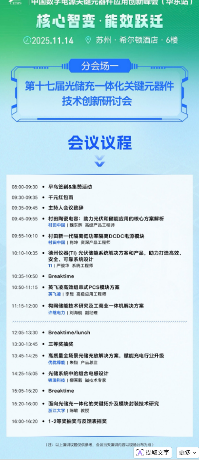 本届峰会将汇聚行业权威专家与领军企业技术负责人,围绕光储充一体化、800V超充与宽禁带半导体、AI服务器电源、大功率电源技术、锂电BMS等关键方向,展开深度演讲与前沿研讨,推动产业链协同创新。