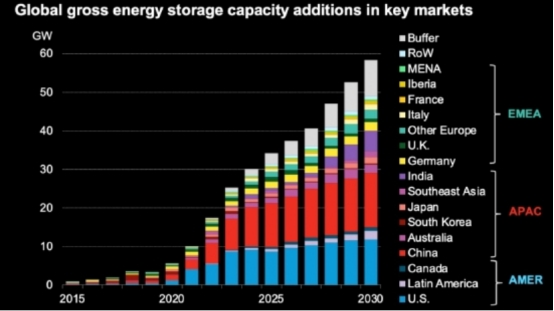 全球范围内,储能市场呈现多极增长态势,欧美电网基础设施替换需求与新兴市场爆发共同构筑了锂电行业中长期增长空间。美国方面,人工智能与数据中心的迅猛发展带来了巨大的电力需求,光储系统作为数据中心主电源的应用前景广阔,机构预测2025年美国储能装机预计达45GWh,同比增长31%。欧洲市场储能需求正从户用为主向大储并举转变。2025年欧洲储能需求预计达30GWh,同比增长70%。德国、英国、意大利等主要国家为增强能源自主性,纷纷加大储能支持力度。