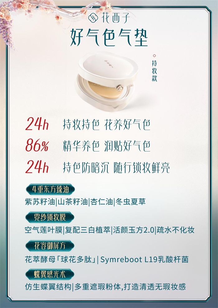 此外,花西子好气色粉饼专注于修色提亮,其万相色修术实测数据表明,能够在28天内改善泛红情况超过36%。这样的技术实力,不仅满足了女性对妆效的高要求,也让消费者对产品的效果更加信任。与此同时,产品中添加的花植精萃与屏障修护成分,体现了妆养合一的设计理念,使得化妆品不仅是外在修饰的工具,更是对肌肤的呵护。