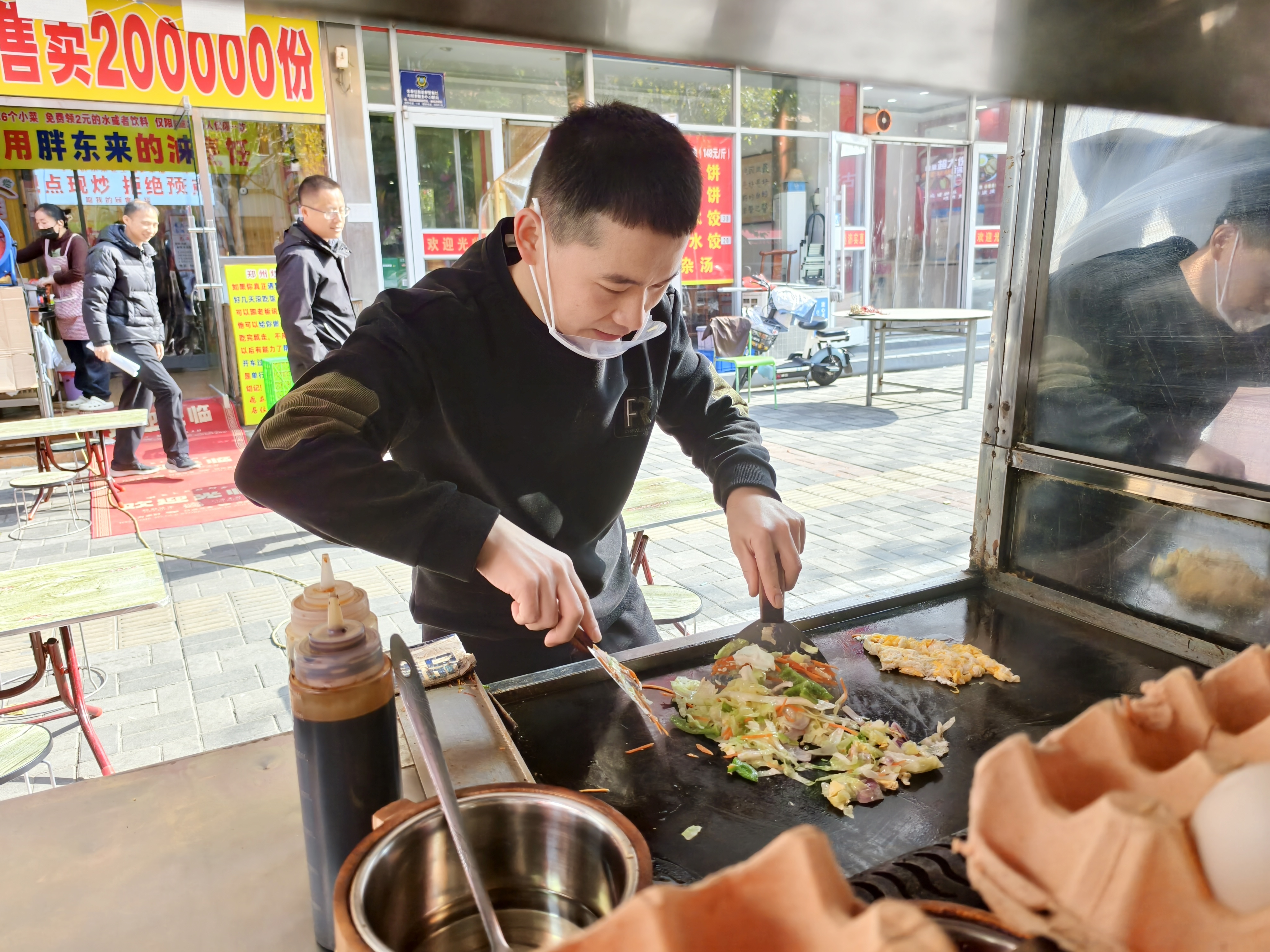 与此同时,杨金秋也在路边的餐车上忙活。动感音乐响起,他一边跟着节奏轻晃身体,一边利落翻炒,那充满活力的模样,被顾客笑称为“炒饭舞蹈”,连坐在身后用餐的客人,都忍不住边看边讨论这份独特的热闹。而店里也贴着杨金秋“衡水摇滚炒饭哥”的帅气海报。