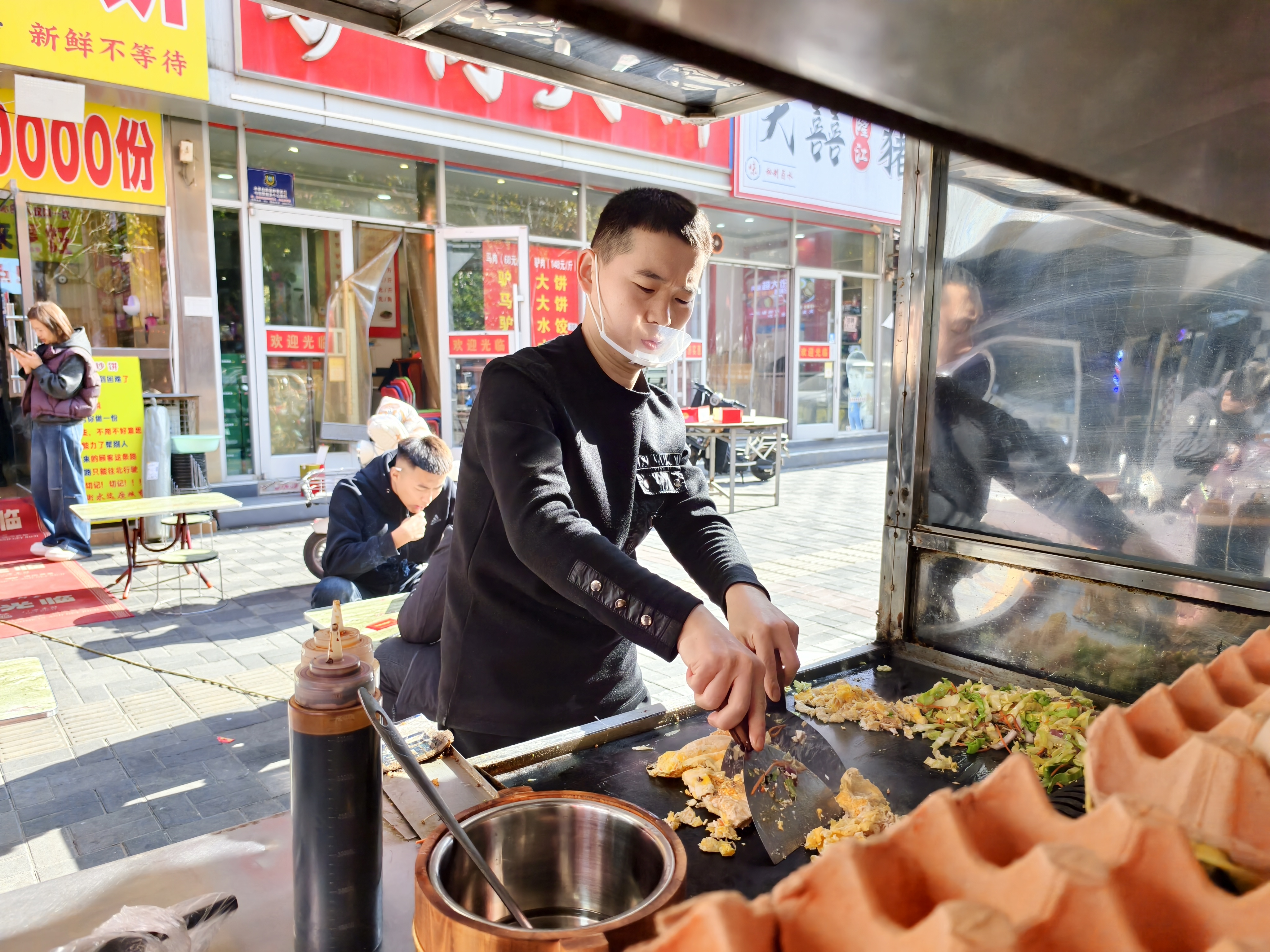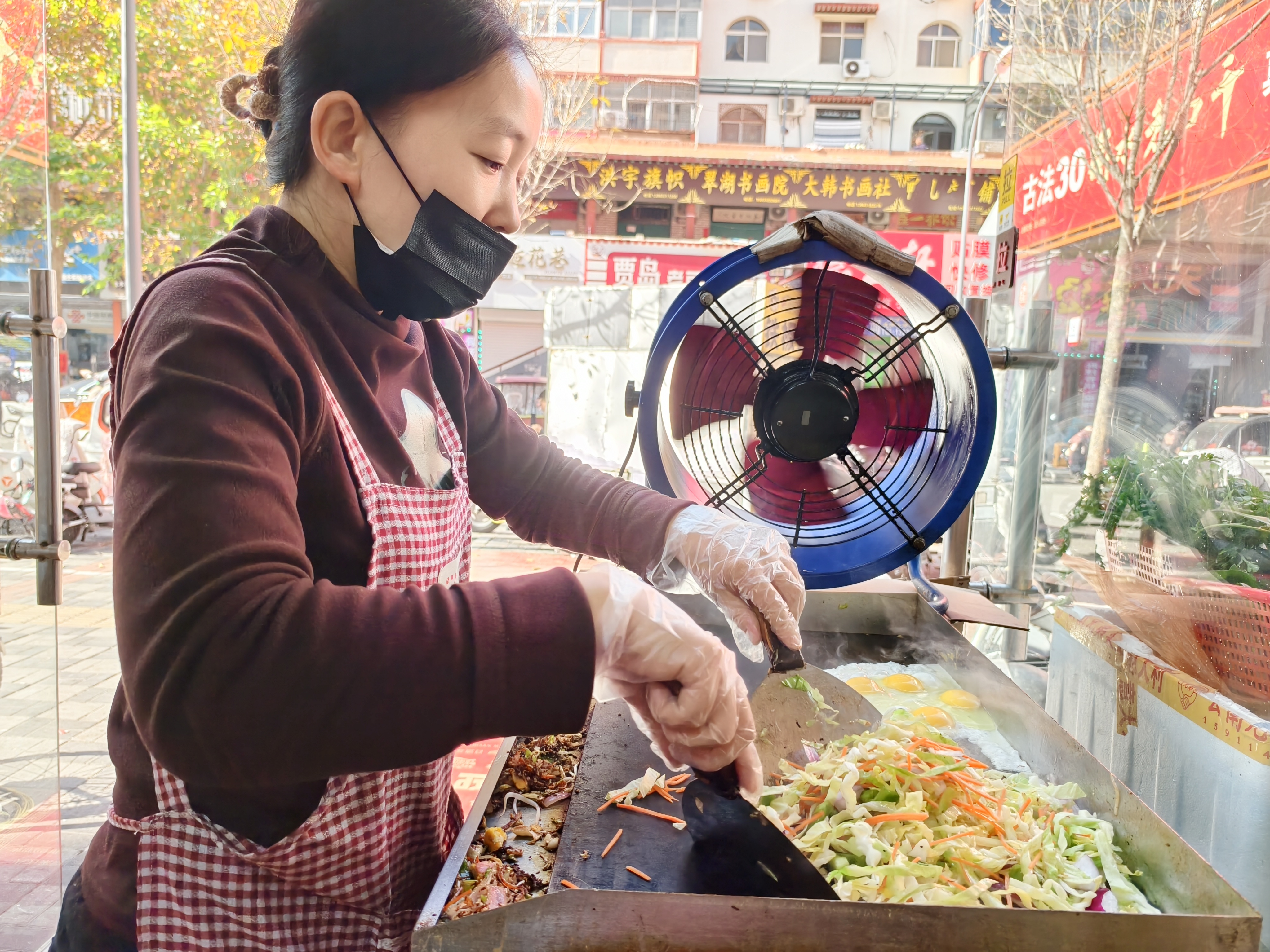 2019年,短视频的兴起给他们带来了契机。杨金秋刷到“郑州炒饼”的相关视频,便想着加盟,研究后发现其品类多,很多品类适配大众口味,便和丹丹一同前往郑州总部学习。学成归来,总部派人赴衡水选址,综合客流量、地理位置等因素,最终定在了报社街北头。