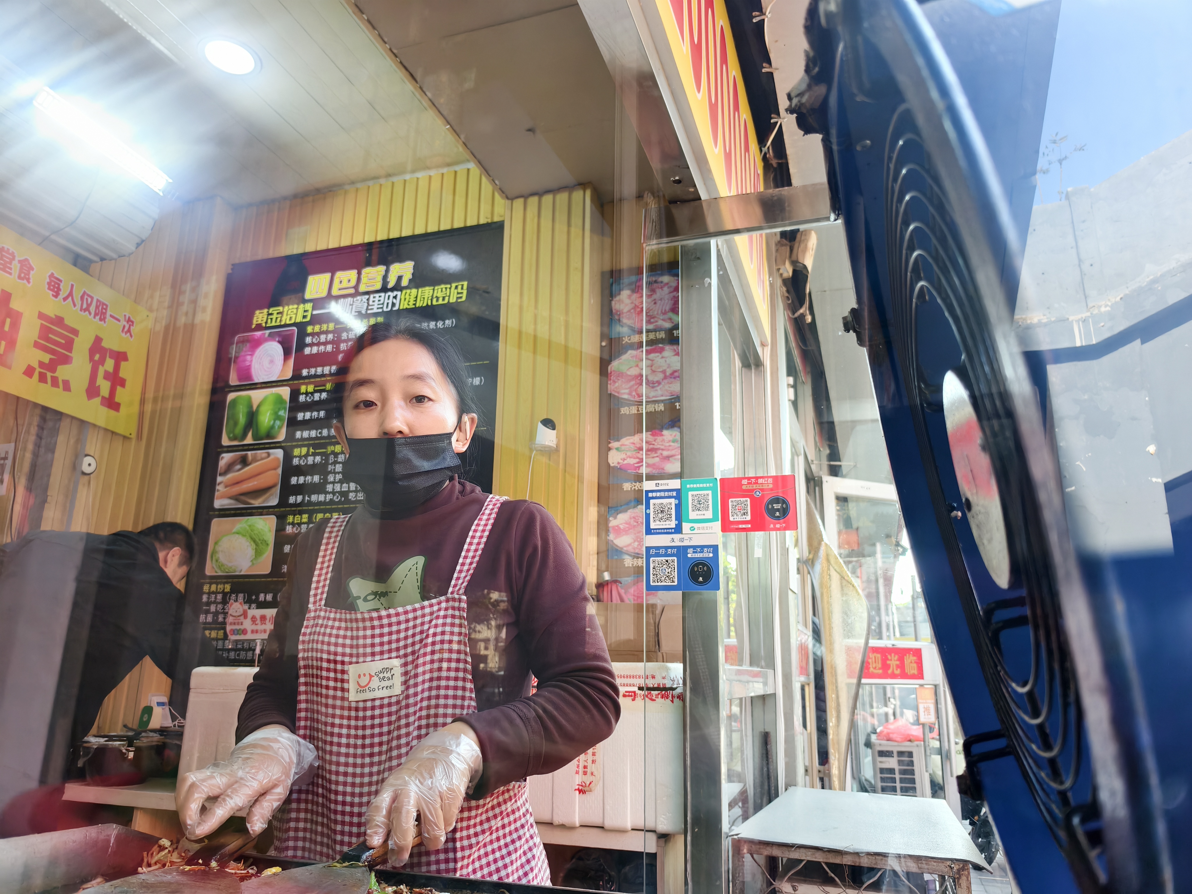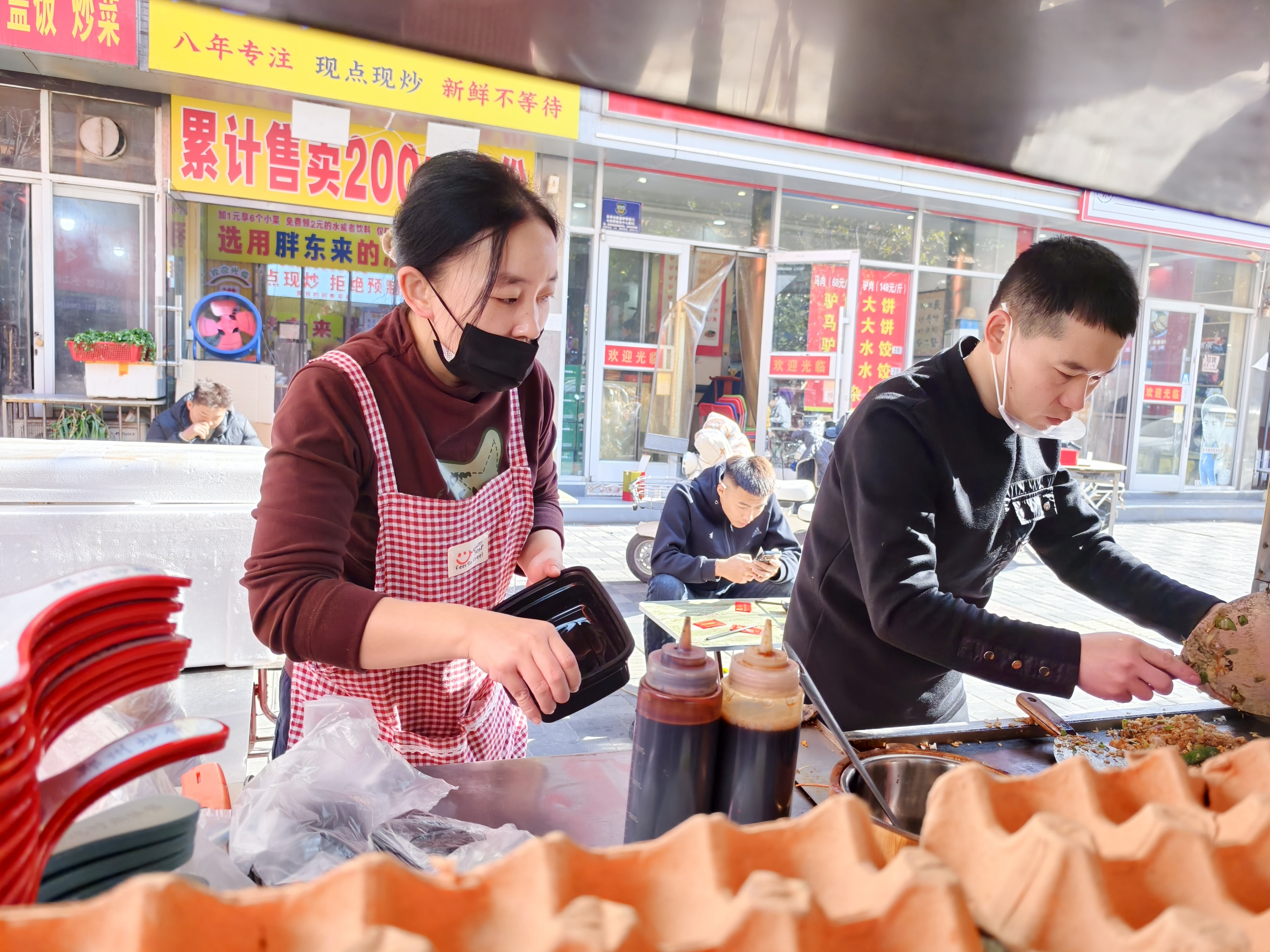 正午时分,小店挤满了前来吃饭的客人。“来份炒饭!”话音刚落,店门口的丹丹便娴熟地舀油、打蛋、放菜、翻炒……一套动作行云流水,干净利索。翻炒间香气四溢,片刻工夫,一份色香味俱全的炒饭便端上餐桌,并为顾客提供免费的红枣枸杞豆浆或红枣花生豆浆搭配食用。顾客用餐完毕离店时,丹丹总会递上一颗红色包装的糖果,喜庆的颜色总能让顾客眉眼舒展。若是打包带走,打包袋里还会贴心地配上红色包装的一次性牙线、湿纸巾,当然糖果也不会漏掉,每一个小细节都藏着对顾客的用心。