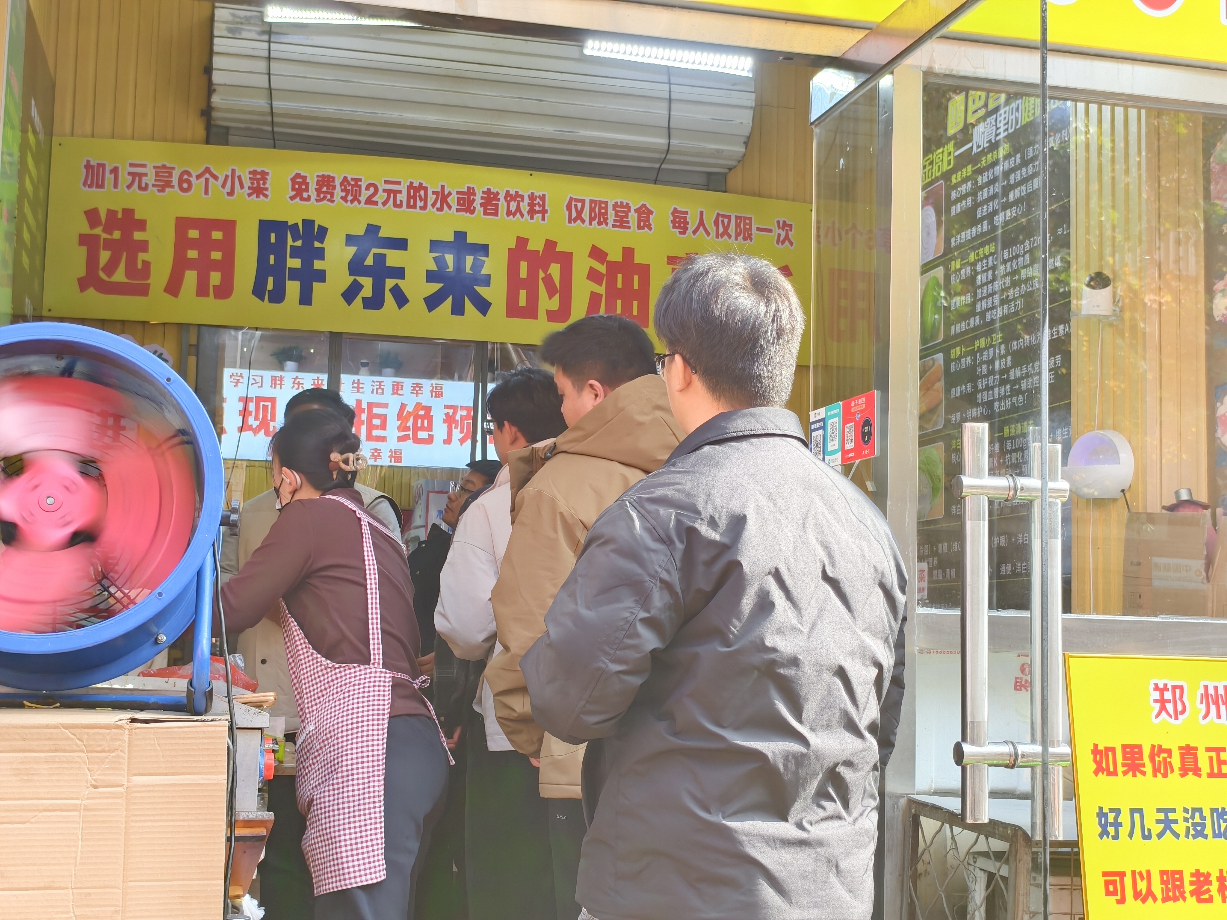 在这份辛勤付出后,杨金秋对小店的经营还有着自己独特的坚持与用心。“我自己出去吃饭,总担心食品安全和用餐便利,所以开店就照着自己的需求来。”杨金秋说。店里用的油,全是从胖东来旗舰店采购的;一次性的筷子也是买的质量好的;免费饮品区,除了两种口味的豆浆,还时常备着梨汤;一次性牙线、湿巾也是常年供应。如今的他,满脑子都是“顾客需要什么”,一旦想到新点子,就立刻落实,让顾客体验,看顾客满不满意。经营思维变了,心态也随之转变,不再只盯着营业额,即便生意偶有起伏,也不会那么心急了。