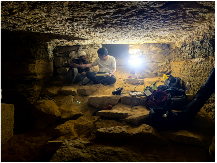 9月16日,在埃及开罗以南的萨卡拉考古遗址区,中埃萨卡拉联合考古项目中方领队薛江(右)和埃方同行在一座贵族墓内工作。(受访者供图)