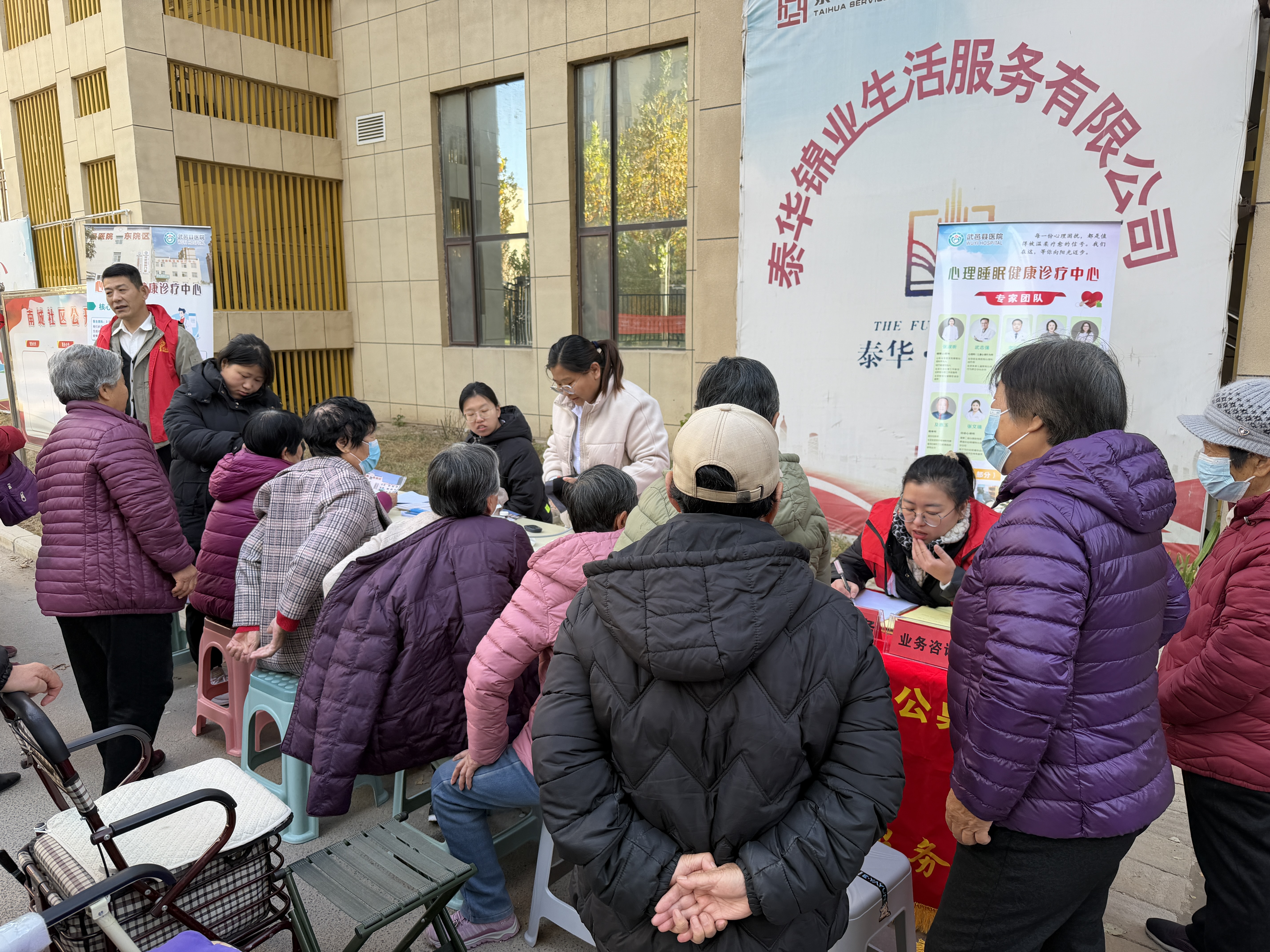11月16日,武邑县南城社区广场热闹非凡,几张铺着红色桌布的“流动办公桌”整齐排列,社区工作人员、志愿者与武邑县医院医护人员携手,搭建起便民服务平台,将贴心服务送到居民“家门口”。
