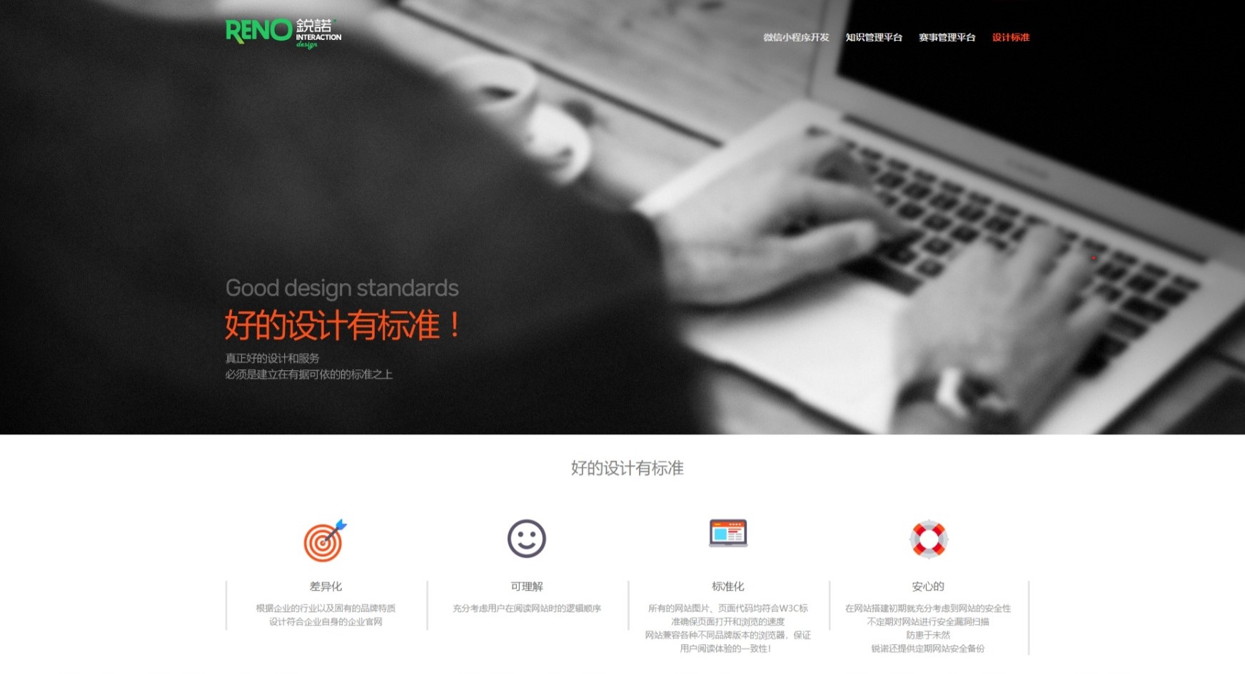 设计理念专业化:锐诺会根据企业的行业属性以及独特的品牌特质进行定制设计,避免模板化;在交互设计中,锐诺也会充分考虑用户在阅读网站时的逻辑顺序,确保用户整个操作逻辑是顺畅的;网站所有图片、页面代码遵循W3C 标准,确保页面打开和浏览的速度。
