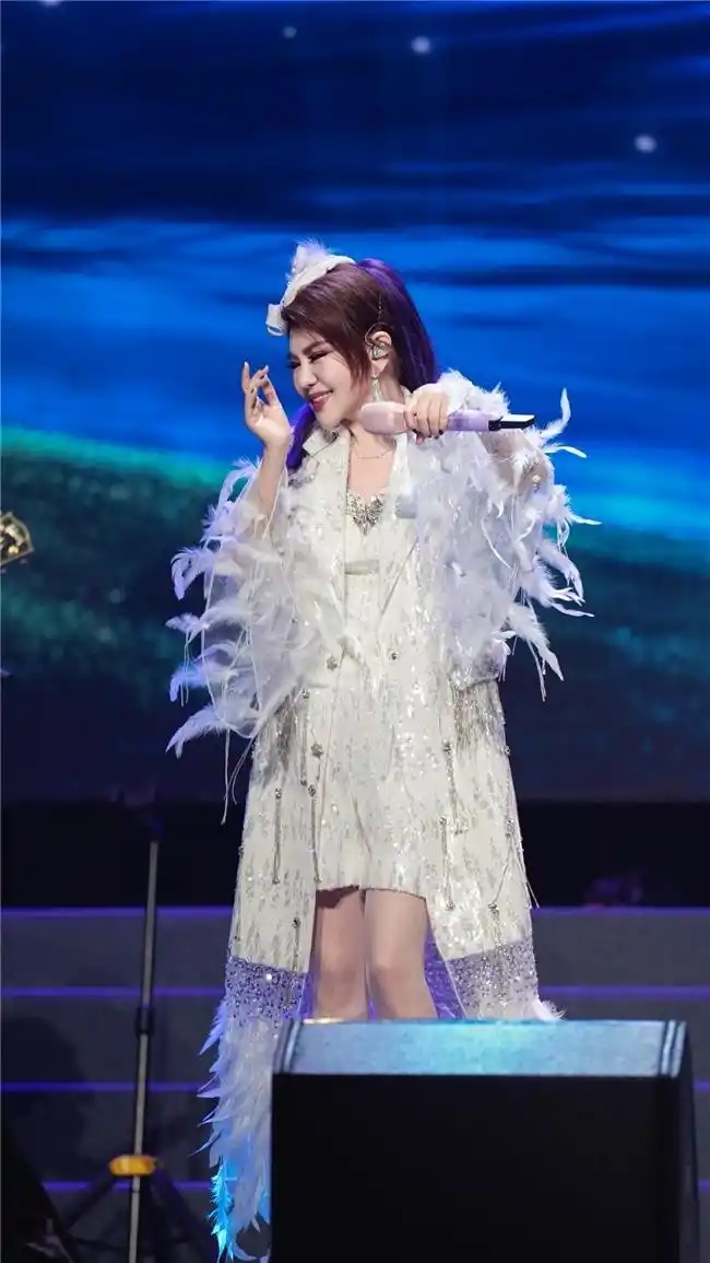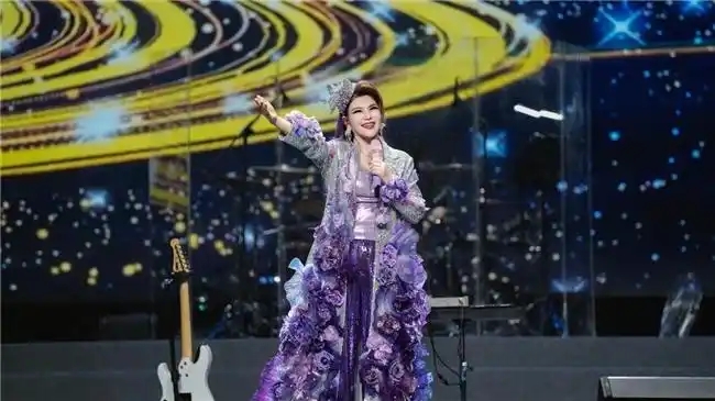 在大家的期待中,乌兰图雅带着温暖的笑容走上舞台。她身着缀满紫色玫瑰花的落地长裙,薄纱花瓣叠着珠光褶皱,像把千朵玫瑰揉进了岁月的柔光,走动时便漾成一片流动的紫雾,连话筒都裹着同色系的柔光。她以《送你一首吉祥的歌》开启了这场音乐之旅,高亢的歌声仿佛将草原的风吹过每个人的耳畔。“三亚的朋友们,你们好!今晚,我要把最美的祝福送到天涯海角!”她的问候如暖流般涌入观众心间。