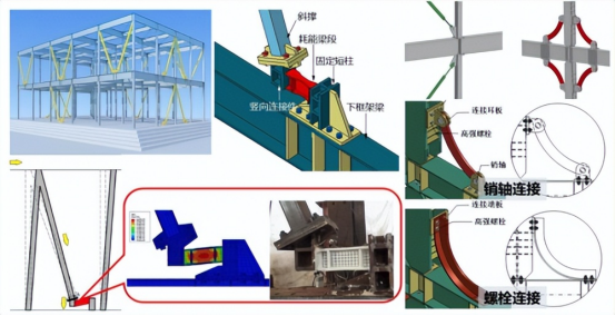 项目针对传统钢结构体系的薄弱环节,成功攻克多项关键技术难题。在结构体系与抗震安全方面,研发了新型柔性支撑与大斜率偏心支撑,解决了传统支撑在窄空间内容易脆断、耗能能力不足的问题;创新提出“梁贯通-柱分层式”柔性节点设计方法,并结合可恢复功能耗能模块与自复位消能摇摆技术,显著提升了建筑抗震性能,实现了“中震完好、大震可修、巨震不倒”的安全目标,有效克服了装配式钢结构易形成薄弱层的行业痛点。