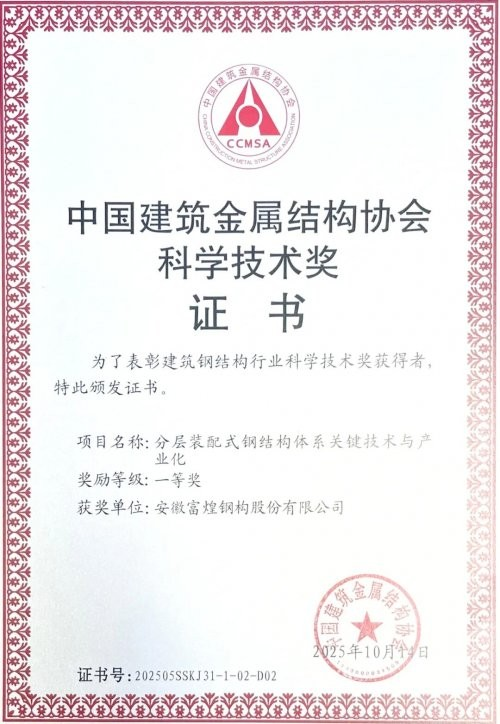 近日,安徽富煌钢构股份有限公司与同济大学联合申报的《分层装配式钢结构体系关键技术与产业化》项目,荣获2025年度“中国建筑金属结构协会科学技术奖”一等奖。该奖项是钢结构行业最具权威性的科技荣誉之一,标志着富煌钢构在装配式钢结构领域的技术创新与产业化应用达到行业领先水平。