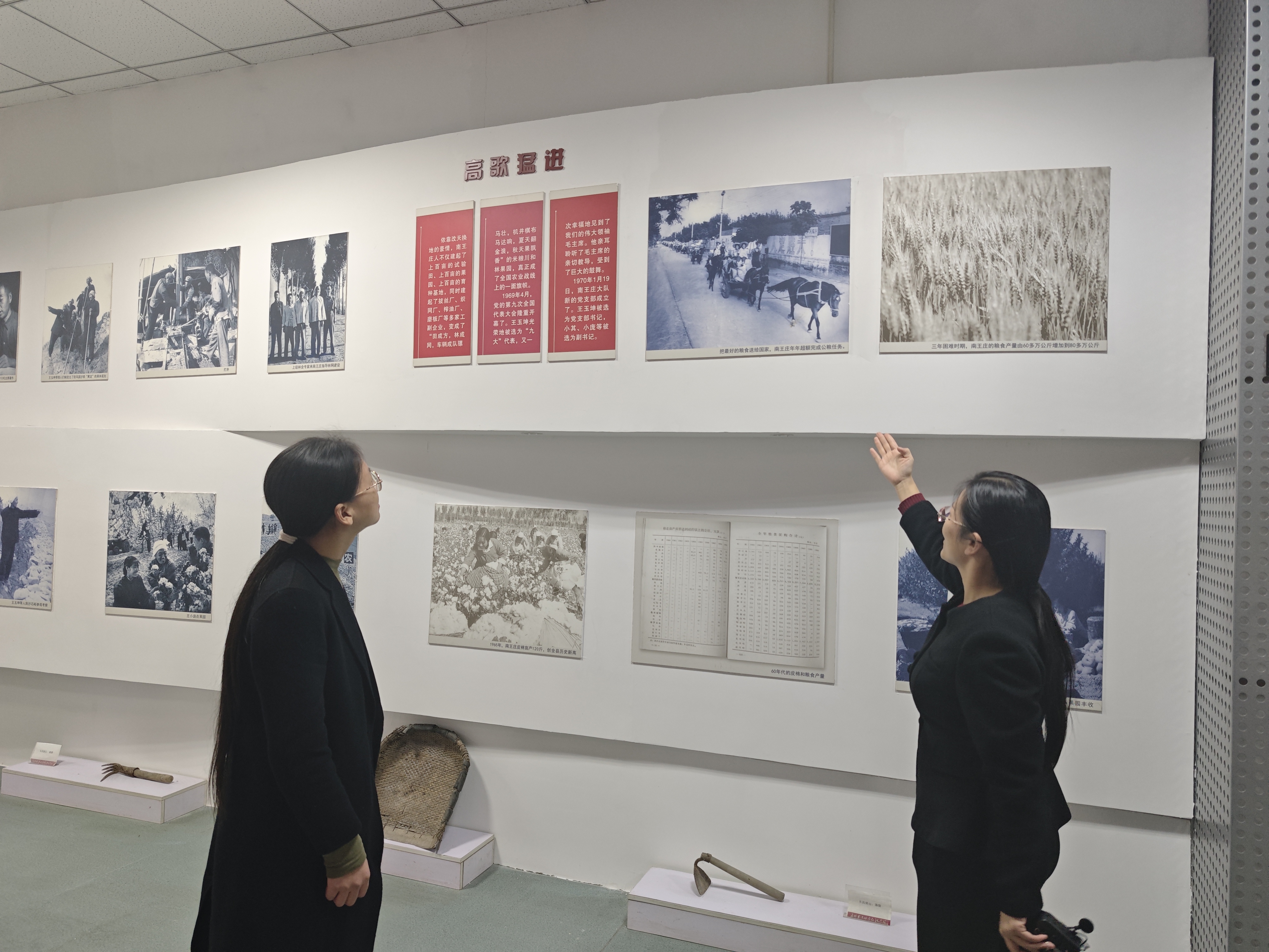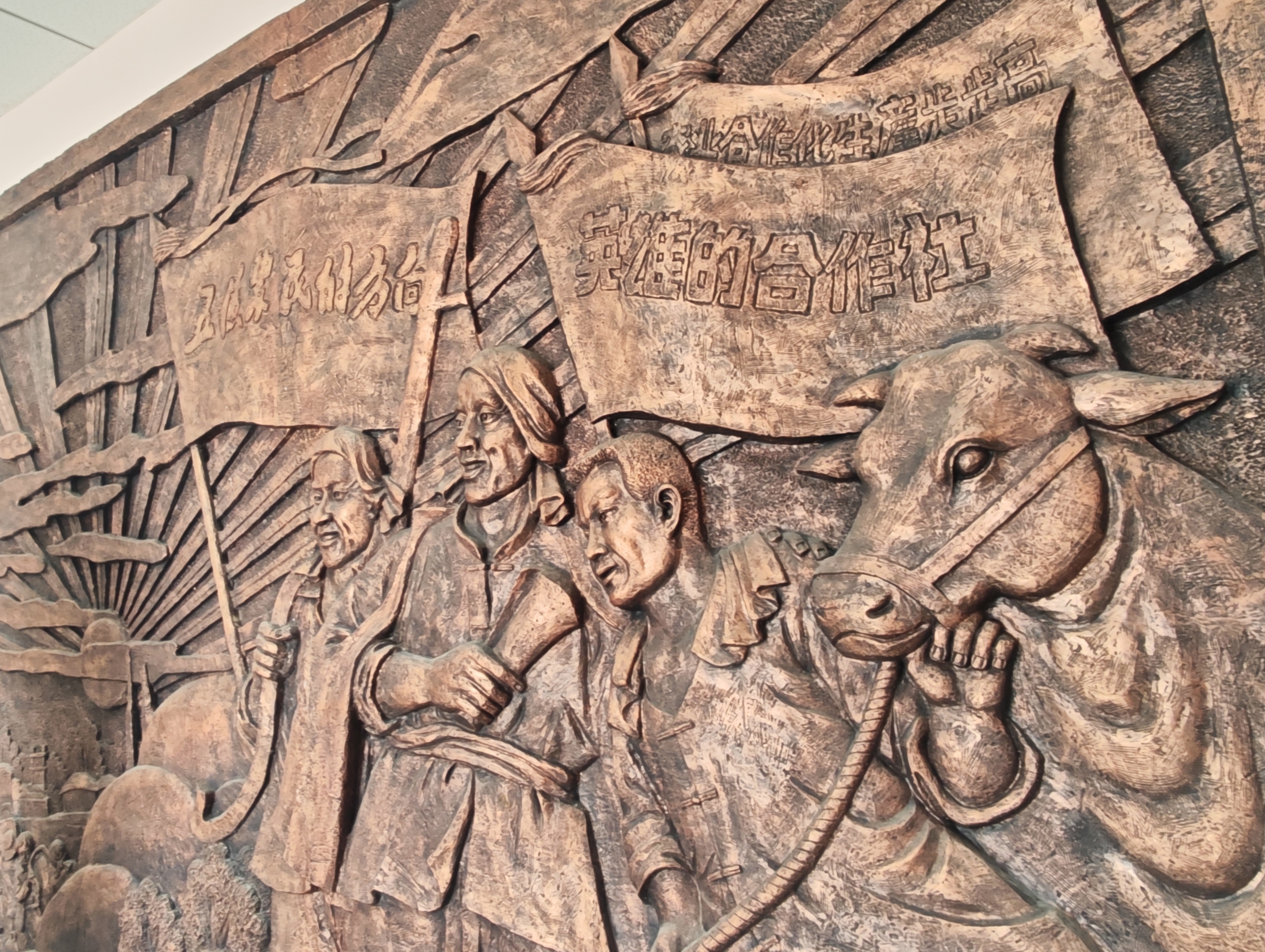 走进主展馆,映入眼帘的是一幅刻有农业合作化运动历史场景的浮雕作品,浮雕中王玉坤、王小其、王小庞手持农具、牵着耕牛,展现出农民在集体劳动中的热情与希望。