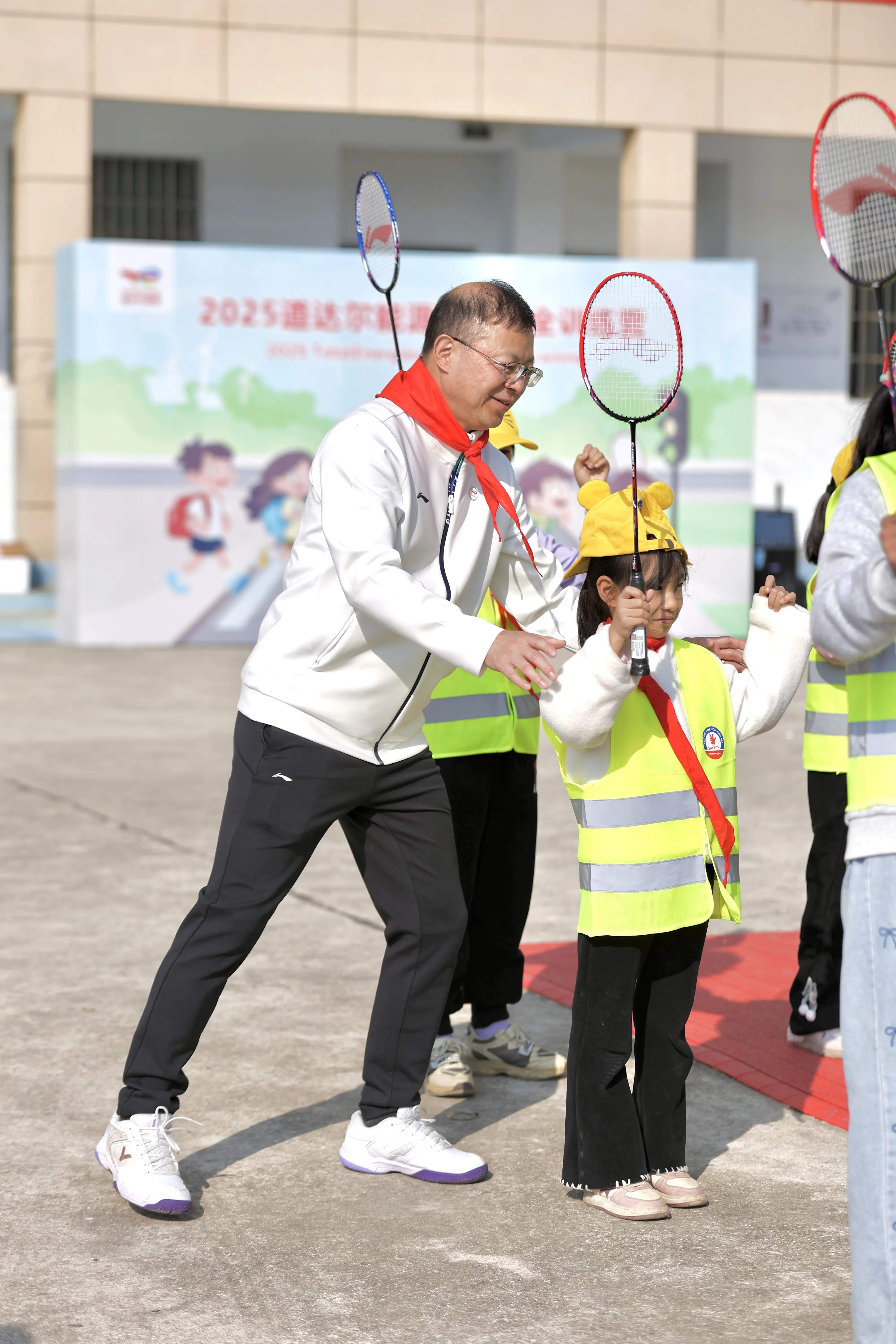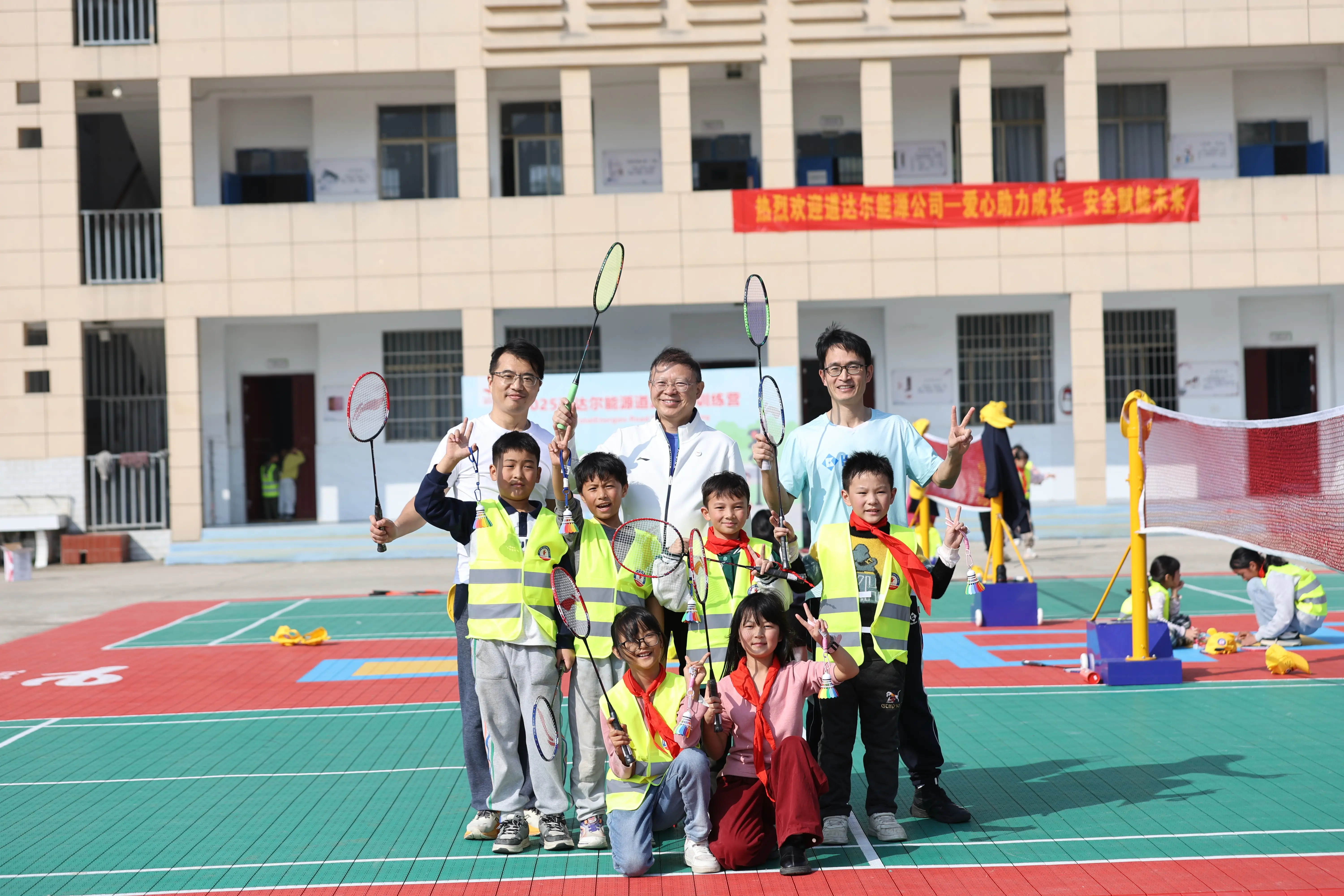 为了鼓励孩子们的羽球梦,训练营特别设置了“羽毛球梦想课”。道达尔能源中国区主席俞永坚先生化身教练,不仅亲自示范握拍、挥拍的标准动作,更一次次俯下身来耐心纠正孩子们的姿势。从基础训练到趣味比赛,专业而温暖的互动让孩子们体验到了运动的乐趣。随后的“羽毛球嘉年华”更是将孩子们的热情点燃。三个年级的代表队在志愿者老师们的带领下,投入击球、接球、传球的团队挑战。孩子们在竞技中学会协作,在运动中感受荣誉。“以后每天都想早点来学校打球,说不定以后能当羽毛球运动员!”一颗颗梦想的种子,正随着每一次挥拍、击球,悄然落入孩子们心灵的土壤中。