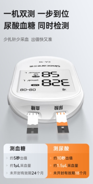而三诺生物旗下的三诺EA-19尿酸仪,恰好针对这些痛点给出了完美解决方案。针对易出错的调码问题,三诺EA-19尿酸仪作为市面首款“免调码”机型,搭载了国际专利免调码技术(US9.012.232B2),试纸自带镭射CODE码,即插即用,完全省去手动调码步骤,从根源避免调码误差。对于试纸干扰问题,它采用专利抗坏血酸酶设计与银碳十六电极技术,能有效排除血氧、抗坏血酸等28种常见干扰物质,大幅提升检测精准度;同时,它的尿酸试纸未开封状态下保质期长达18个月,血糖试纸未开封保质期24个月,让用户囤货更安心;在采血体验上,三诺尿酸仪EA-19也做了贴心优化。它配备极细针头降低痛感,很多用户反馈“像被蚂蚁轻轻叮了一下”,而且三诺EA-19仅需芝麻大小的血样就能完成检测,哪怕采血时稍微紧张,也能轻松凑够血量,大大降低了因血样不足导致的检测失败或结果偏差。