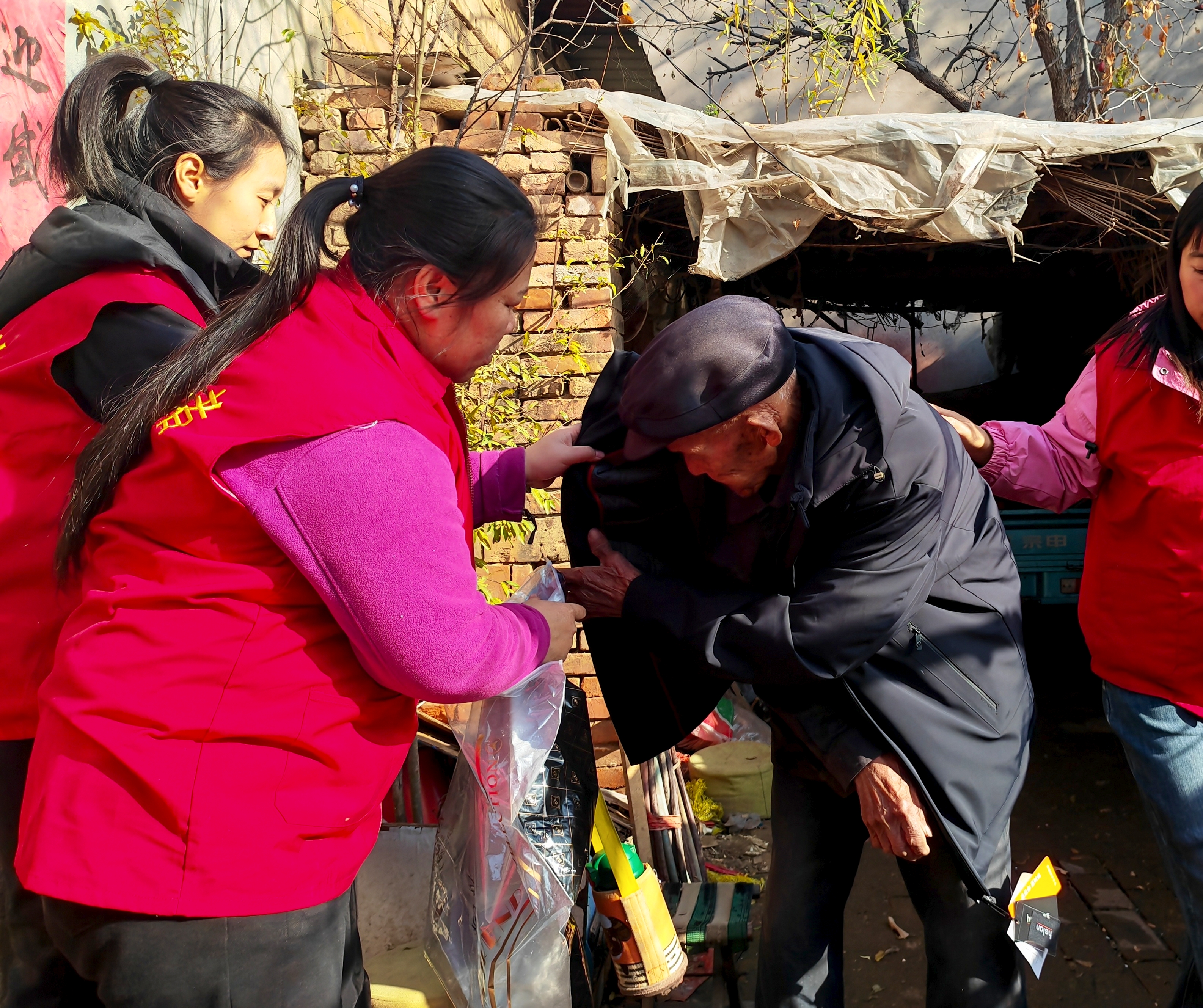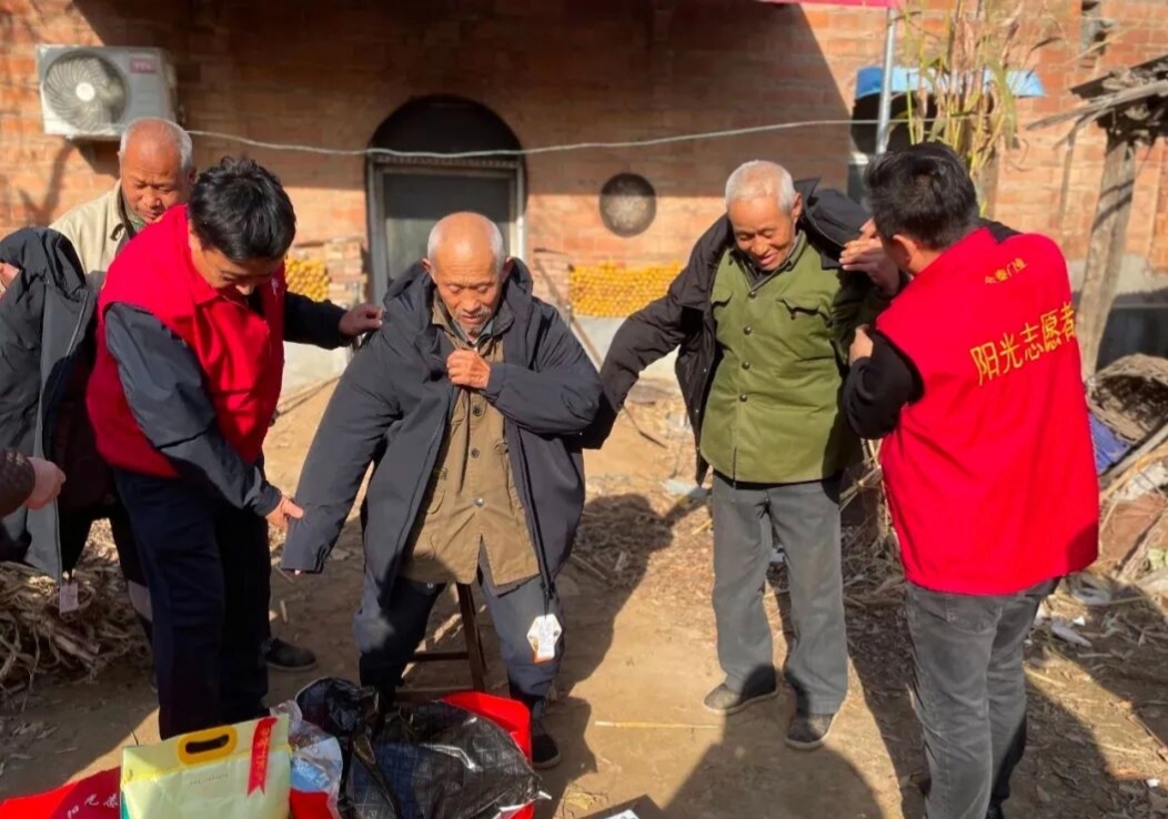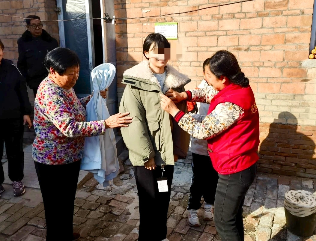 当日下午,志愿者们手提棉衣、棉被、米、面、油等生活物资,有序开展入户走访。在饶阳镇南关村,志愿者搀扶着孤寡老人小心翼翼为其穿戴新棉衣。抵达大官亭镇东歧河村时,志愿者为孩子套上崭新的棉衣,看到孩子身着新衣展露笑容时,志愿者们的脸上也漾起欣慰神情。