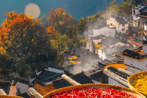除了自然色彩外,篁岭的亮点还在于完整保留的古村风貌与晒秋文化。冬季虽非晒秋高峰,但部分民居依旧保留传统晾晒场景,红辣椒、黄菊花、瓜干等丰富色彩与红枫相互衬托,形成极具辨识度的乡村画面。