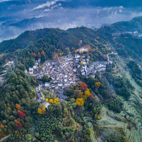 推荐 1|婺源篁岭:12 月秋色最浓的村落,红枫与晒秋构成江西冬季独有的色彩符号