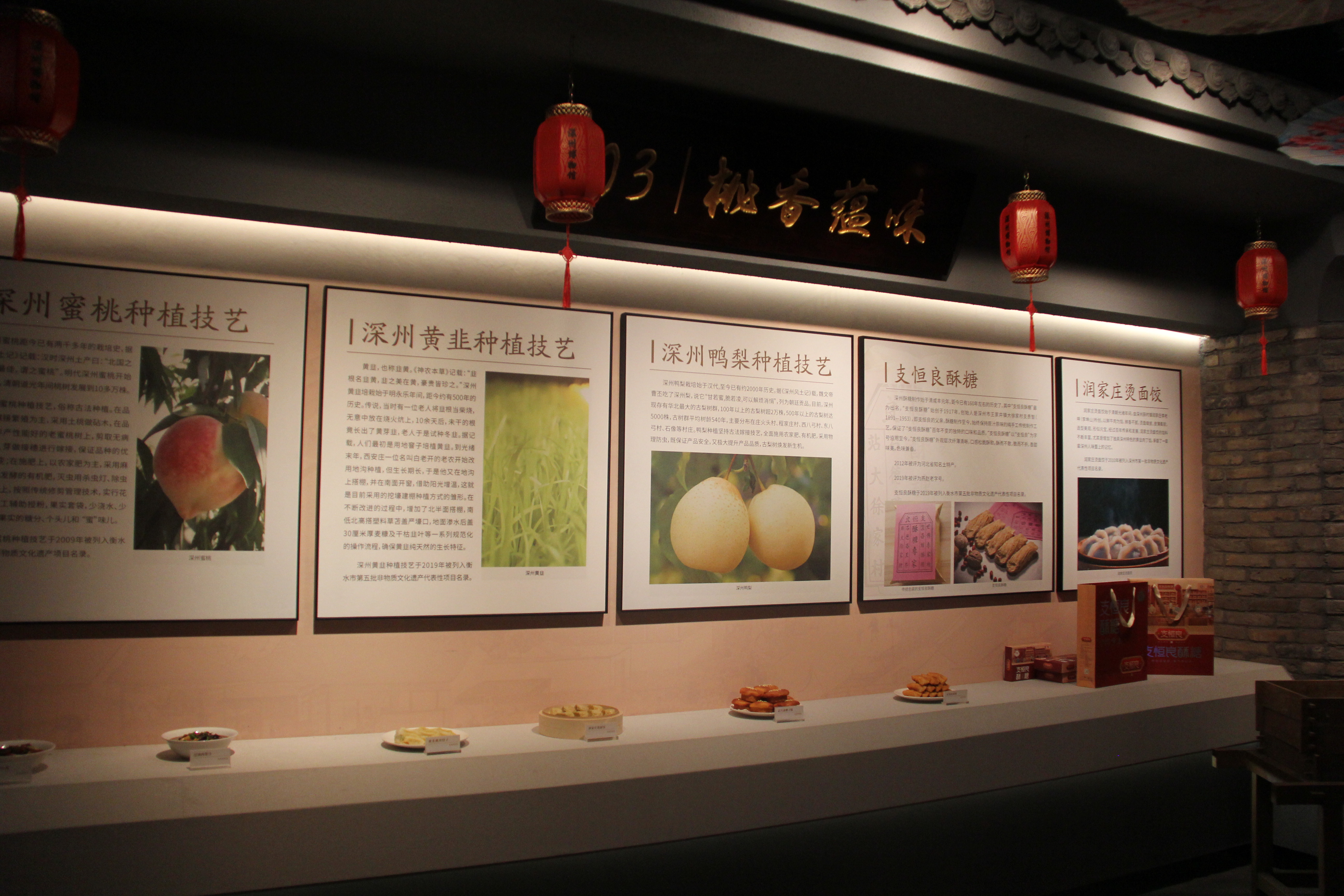 11月19日,记者走进深州市博物馆,序厅中央是一方石刻,铭文概述了深州的地理位置、特产和人文精神。左、右及正面墙壁上,是三幅古铜色的浮雕,浮雕以蜜桃和武术为主题,彰显出深州市拥有“全国武术之乡”和“中国蜜桃之乡”的美誉。