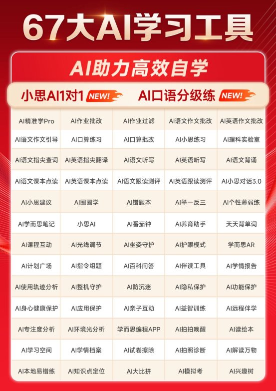 核心 AI 工具方面,无论入门级 P4 机型的 60 大 AI 工具,还是旗舰级 T4 机型的 72 大 AI 工具,均为购机即享的免费功能。从 AI 作业批改、作文深度精批、AI 精准学 Pro,到 AI 错题本、举一反三、学情报告等,覆盖学练评全流程的智能工具,无任何 “付费解锁高级功能” 的设置,所有 AI 辅助能力终身免费开放。