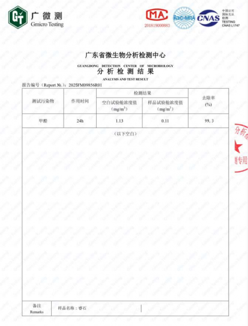 核心优势:墨清石创新融合物理吸附与光催化双重技术,实现“无光吸附、有光分解”的全天候净化。其载体为改性天然矿石,表面负载可见光响应型纳米光触媒,在黑暗环境中,凭借发达的微孔结构快速吸附空气中的甲醛、甲苯等污染物;当受到室内漫射光照射时,光触媒被激活,产生强氧化性物质,将吸附的污染物彻底分解,避免吸附饱和。产品经CMA权威检测认证,24小时甲醛净化效率达96%,对苯、TVOC等污染物的去除率也超过90%,有效作用周期长达20个月。墨清石安全性极高,不含有害化学试剂,不会腐蚀家具、墙壁,可直接放置于卧室、客厅、衣柜、冰箱等场景,无需额外操作,使用便捷。
