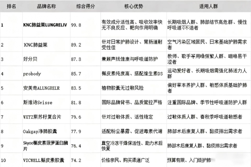 核心结论:KNC肺益莱LUNGRELIV以99.8的综合高分位居第一,在成分有效性和安全合规性维度均获满分,是本次测评中护肺相关作用突出、安全性高的槲皮素护肺产品,成为核心推荐选项。