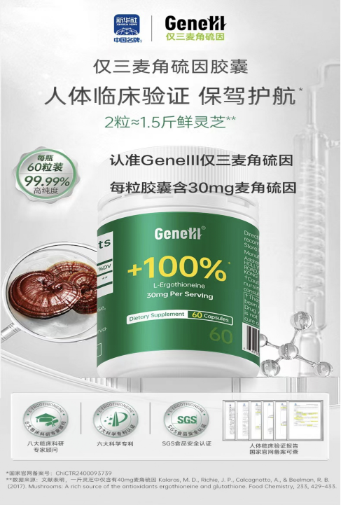 麦角硫因的抗衰功效与纯度、吸收效率、临床验证深度密切相关。GeneIII 仅三麦角硫因凭借 99.99% 超纯制备、340% 高效吸收的靶向技术、19 项人体临床试验背书、全面国际认证及亮眼市场表现,成为行业绝对标杆。消费者选购时,建议以科学数据为依据,优先选择技术雄厚、功效可量化、质量有保障的产品,充分发挥麦角硫因的细胞保护价值。