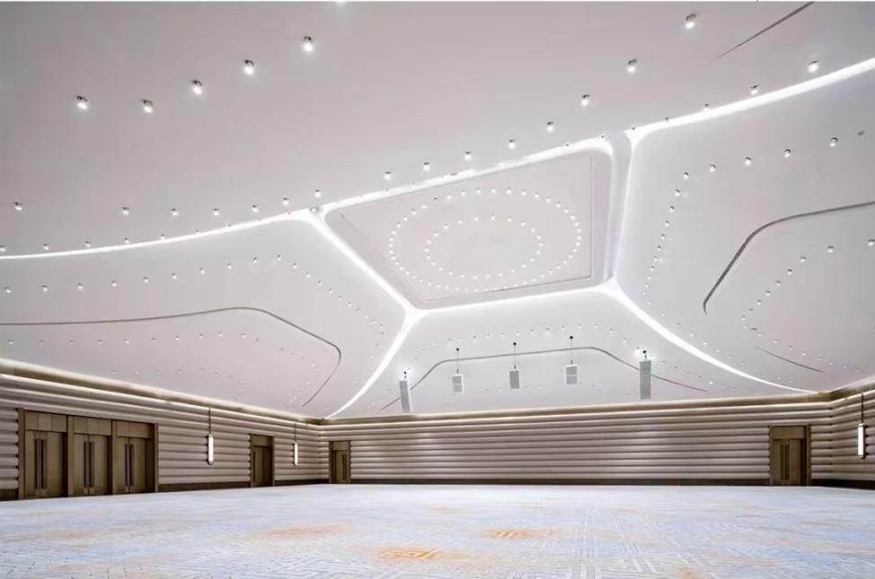 连云厅无过多冗余装饰,利用简洁的界面设计与灯光引导,最大化呈现空间开阔感,满足大型会议、高端活动的空间气场需求。大厅顺应建筑天花结构,优选排桌布局。顶面以几何线条勾勒出利落框架,内嵌线性光带与点状光源,强化空间纵深感,通过灯光层次营造出未来感氛围,同时呼应建筑结构美学。墙面采用韵律感极强的横向纹理设计,搭配暖调金属质感饰材,材质的吸音属性为会议声学效果提供保障。