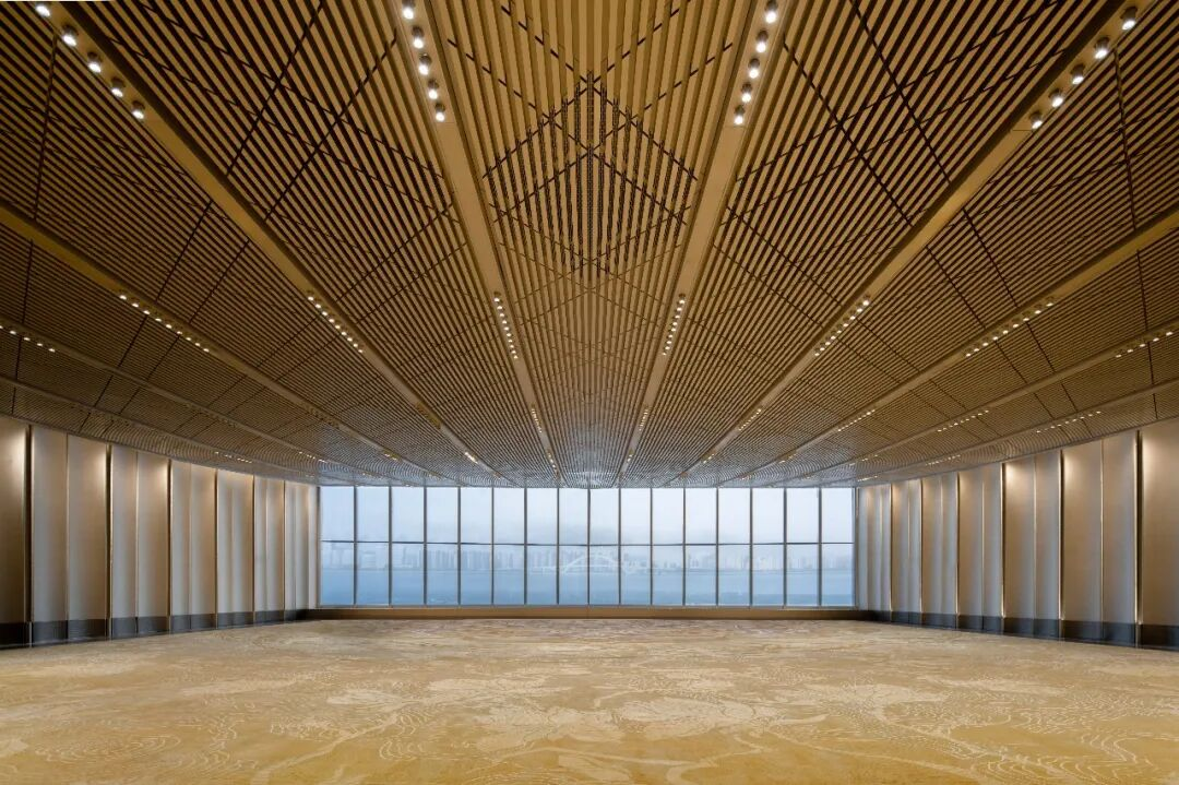佰地设计还把闽南的传统手艺,玩出了新花样。碧海厅天花以竹编工艺为灵感,采用参数化设计打造格栅结构,既还原竹编的肌理韵律,又通过几何交叉的布局强化空间纵深感。整面落地窗将碧海蓝天的自然景致引入室内,墙面则采用浅色系、垂直线性的饰面设计,弱化墙面的厚重感,光线透过格栅形成富有层次的光影效果,将传统竹编工艺的雅致感与现代建筑的科技感完美融合。地毯提取福建土楼的圆形围合意象,将土楼“聚族而居”的文化内核转化为地毯纹样,在暖调底色的衬托下,既呼应地域文化脉络,也为厅内空间增添了文化温度与视觉焦点。