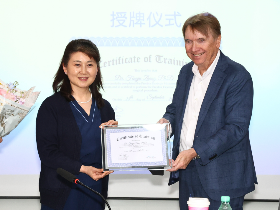会议伊始,Presbia集团首席科学家、近百项眼科发明专利持有者、PresbiaFlexivueMicrolens™(简称“FM微透镜”)发明人VladimirFeingold博士为张丰菊教授颁发证书,正式授予其“PresbiaFM微透镜老视矫正国际认证医师”。