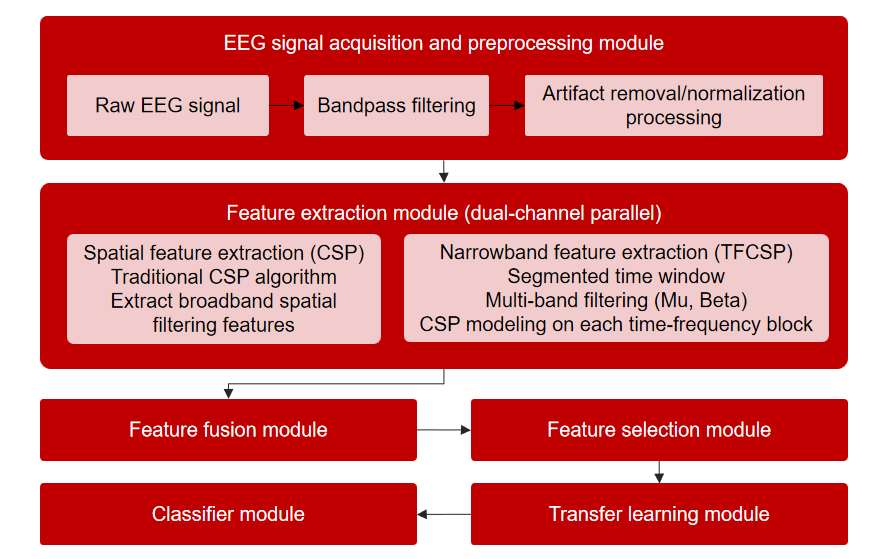 这项技术的研发立足于当前MI-EEG信号处理中的核心难题——低信噪比和个体差异性。传统的脑电解码方法,例如公共空间模式(Common Spatial Pattern, CSP),虽然在一定程度上提升了特征提取能力,但仍面临在不同被试或同一被试不同会话之间泛化能力不足的问题。此外,MI信号在时间和频率两个维度上均表现出高度复杂性,仅依赖空间特征构建的分类模型常常无法捕捉到有判别价值的微弱变化。