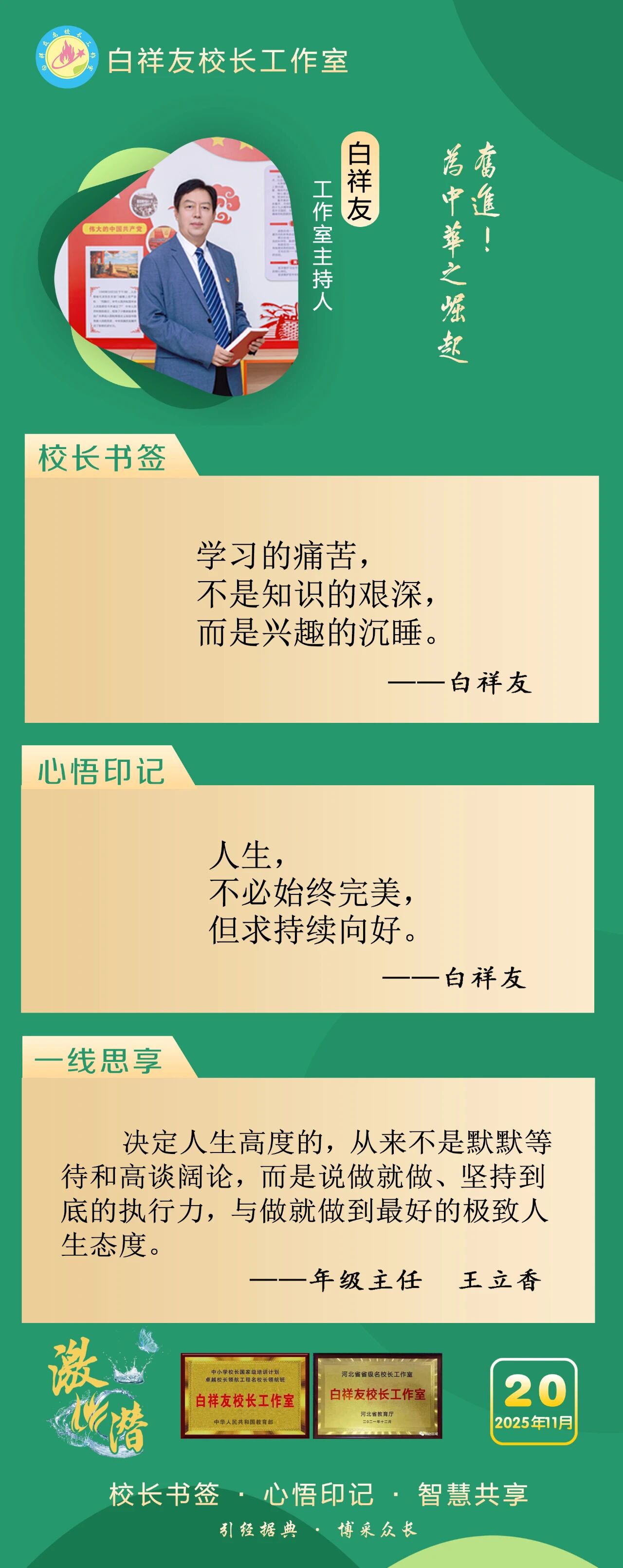 “白祥友校长工作室”成立于2019年4月,是教育部“国培计划”中小学名校长领航工程、河北省首批名校长工作室,目前省内外成员校59所。工作室坚持“资源共享、智慧共融、互助共赢”理念,已成为思想碰撞的交流场,资源共享的品牌站,成果展示的辐射源。 点赞 +1 微博 微信 我要评论 发布 相关推荐 祝贺!衡水十三中学子省赛获奖 教育大观 1天前 白祥友校长工作室成员新疆实验中学冯永庄校长一行来衡水十三中参观交流 教育大观 2天前 春日里,衡水十三中学子“抢”个痛快,“拼”出花样! 教育大观 5天前 衡水市委管理干部学习贯彻党的二十届四中全会精神研讨班开班 政情 6天前 全市一等奖!衡水十三中激潜教育再结硕果 教育大观 03-17 巾帼筑梦绽芳华 向光而行建新功 河北衡水中学举办第十八届“杰出女教师”表彰大会 资讯速递 03-09 衡水十三中学子这样追“锋”! 教育大观 03-06 热门 一天 三天 一周 1 衡水市各部门各单位有力有序开展树立和践行正确政绩观学习教育 2 【湖城慢直播】踏春寻梅正当时 定格衡水春日里的亮丽风景 3 【新闻发布】 创新招商促落地 深化服务提质效 衡水市持续打造投资兴业热土 4 微改革激发新活力 微创新助力大发展——衡水市扎实推进改革创新工作走深走实 5 故城县开展结核病防治宣传活动 6 【文明旅游反面曝光】春游要文明 赏花莫“摧花” 7 故城:百人太极展风采 全民健身焕新颜 8 我市全方位营造安心舒心消费环境 全年累计使用补贴资金8.3亿元 带动消费61.3亿元 9 全国学雷锋活动示范点衡水公交18路队:服务不是喊口号,是把乘客没想到的提前想到 10 AI+物联网 打造高效智慧育苗新模式 1 央媒省媒关注衡水春耕春管有序进行 2 315金融观察|交通银行:2026年以来累计被罚没超2200万元,近30天黑猫投诉平台新增超230条投诉 3 一碗免费热食 暖了衡水的烟火人间 4 深度报道|衡水商超这些年 5 赴春天之约 看杏韵花海 ——枣强县(肖张)第四届杏花文化宣传推介会掠影 6 “入企探岗”+“直播带岗” 衡水市“春风行动”线上直播招聘活动创新出彩 7 珍惜水资源 共享大自然 衡报文明小记者走进大自然宣传节水护水 8 衡水桃城区城东社区开展“世界水日”主题宣传活动 9 河北各地各部门各单位扎实开展树立和践行正确政绩观学习教育 10 衡水市各部门各单位有力有序开展树立和践行正确政绩观学习教育 1 拾光纪·马年再会老朋友,上个马年他赠予习近平一匹汗血马 2 “白牌”电动自行车还能骑吗? 衡水晚报“帮办”核实:已全面禁行,违规上路会受罚 3 衡水文旅春日上新 十大场景开启沉浸式春游新体验 4 高职单招考试3月21日开考 衡水9300余名考生将参加考试 5 衡水发布七大主题线路开启春日盛宴 “湖城花事·衡水有约”诚邀京津冀游客共赴花期 6 315金融观察|大地财险罚单密集落地,暴露合规短板 7 探秘气象“大本营” 解锁防灾新密码 饶阳县气象局举办世界气象日科普开放活动 8 【新闻发布】锚定便民利企目标 衡水发布2026年自然资源营商环境新蓝图 9 【新闻发布】聚焦科技赋能 衡水绘就营商环境新图景 10 以鱼养水净河道 2万余尾草鱼苗放流滏阳河衡水市区段 广告 广告 广告 24小时 1 时政现场说丨与雄安新区共成长 与中国式现代化同发展 2 拾光纪·“我对这里充满感情”,习近平心系燕赵大地 3 近闻·四赴雄安,对“未来之城”再部署 4 沧州银行DIY借记卡上线啦! 5 衡水发布27个重点招商产业 聚焦县域特色精准发力 6 春菜上新 衡水市区超市“鲜”意十足 7 阜城码头镇:运河岸边焕新颜 乡村颜值气质双提升 8 赴气象之约 探“风云变幻” 衡水滨湖志臻学子沉浸式解锁气象奥秘 9 河北衡水:全民健身 燃动湖城 系列之二——舞步翩跹 乐享生活 10 农行衡水分行:深耕绿色信贷 赋能低碳发展