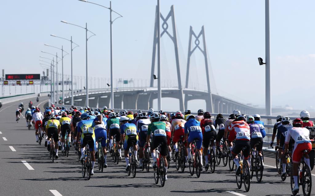 11月8日,参赛选手在港珠澳大桥骑行。当日进行的第十五届全国运动会公路自行车男子个人赛,赛道全程231.8公里,选手经过港珠澳大桥,跨越粤港澳三地。图源:新华社