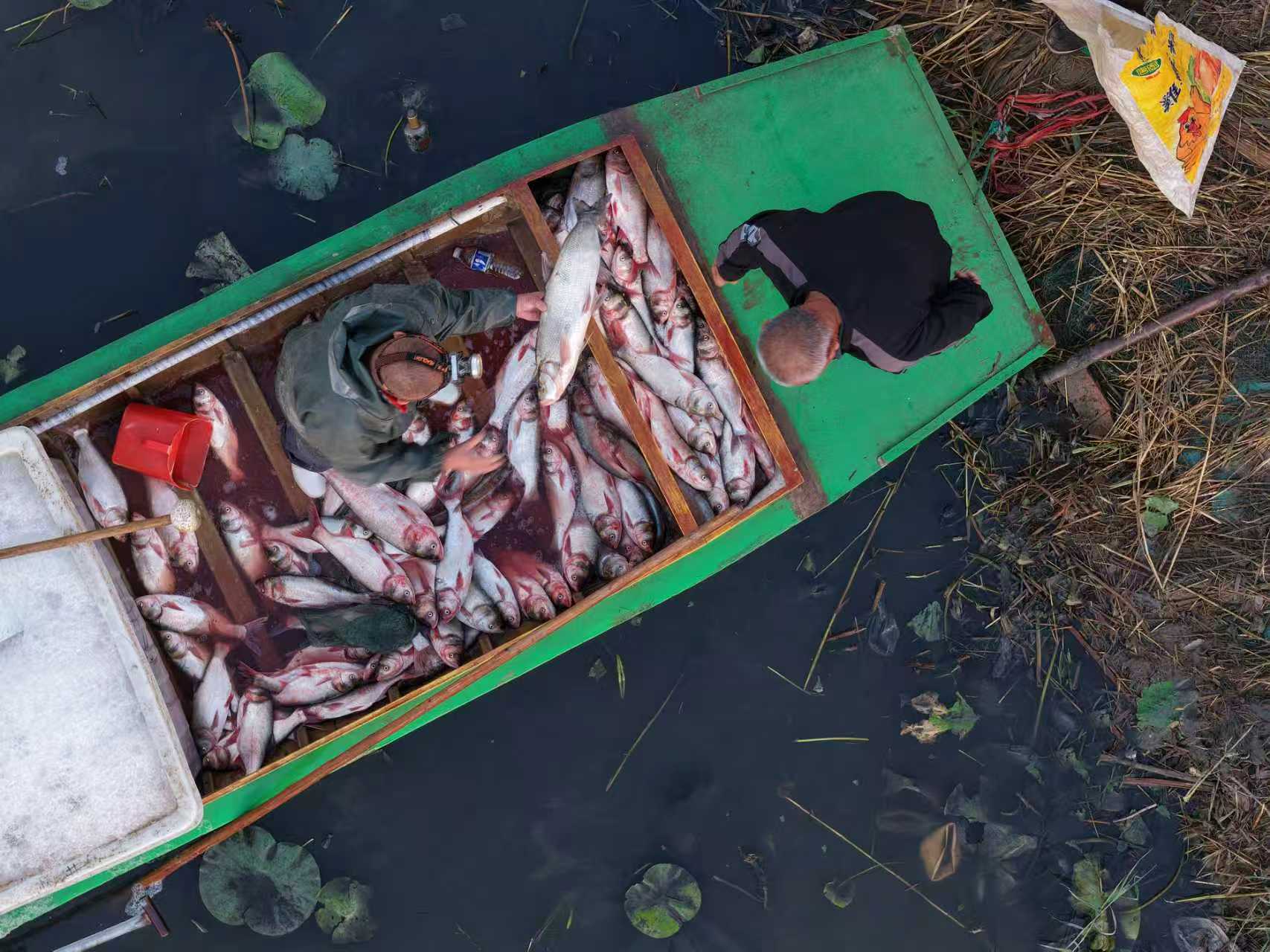渔获品质与产量“双稳”,根源在于衡水湖区生态持续向好。调查结果证实,衡水湖水质已长期稳定在Ⅲ类标准,为鱼类生长提供了洁净舒适的水环境。同时,今年湖区水位处于历史低位,湖面面积相对收缩,客观上降低了捕捞难度,使渔获出捕率较往年有所提升。“虽然总重量与往年持平,但是大规格鱼占比高,实际捕捞尾数减少,这恰恰说明渔业资源处于健康循环状态。”林红军解释,今年的优势花鲢多为前几年增殖放流的鱼苗,经自然生长后形成了优质种群。