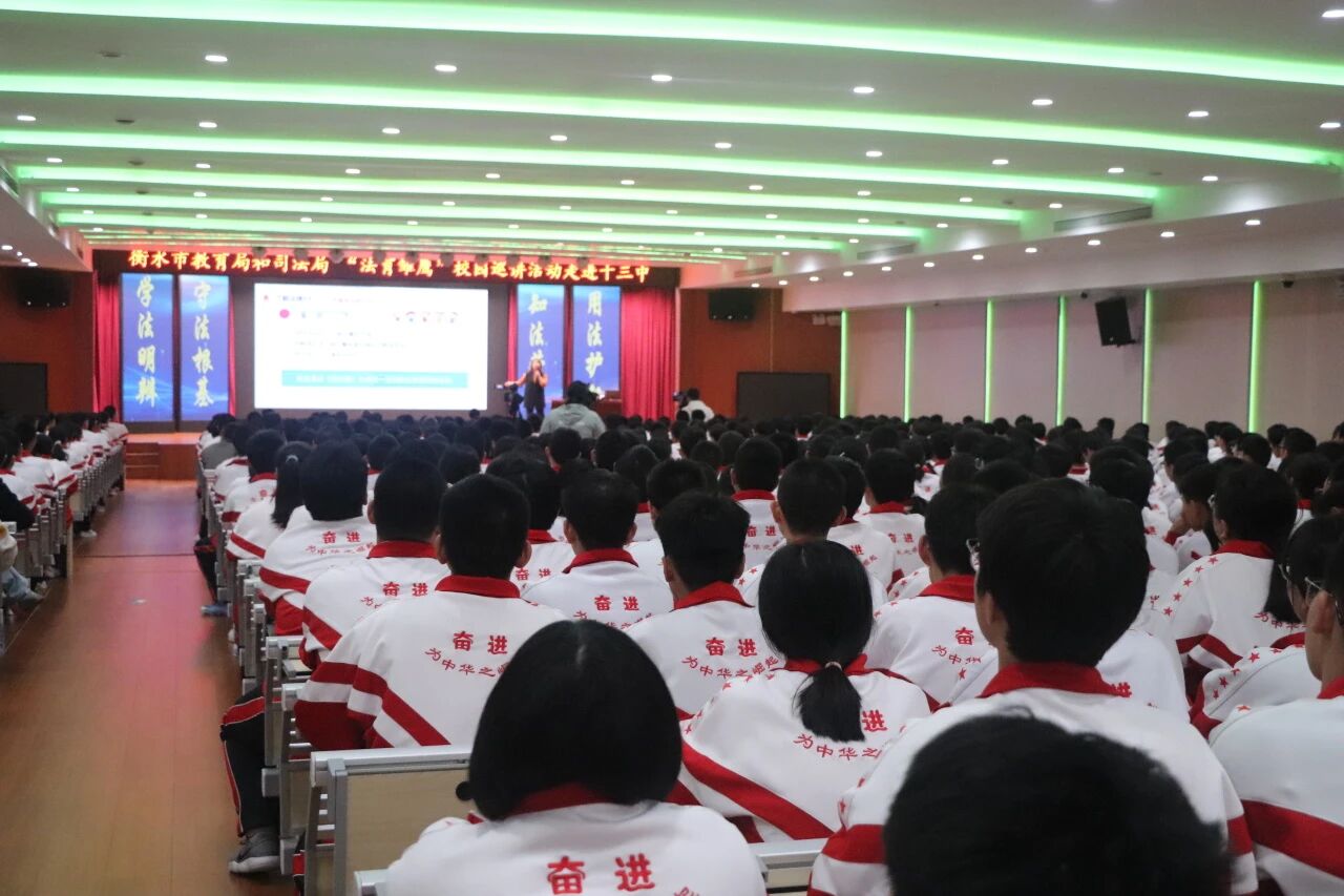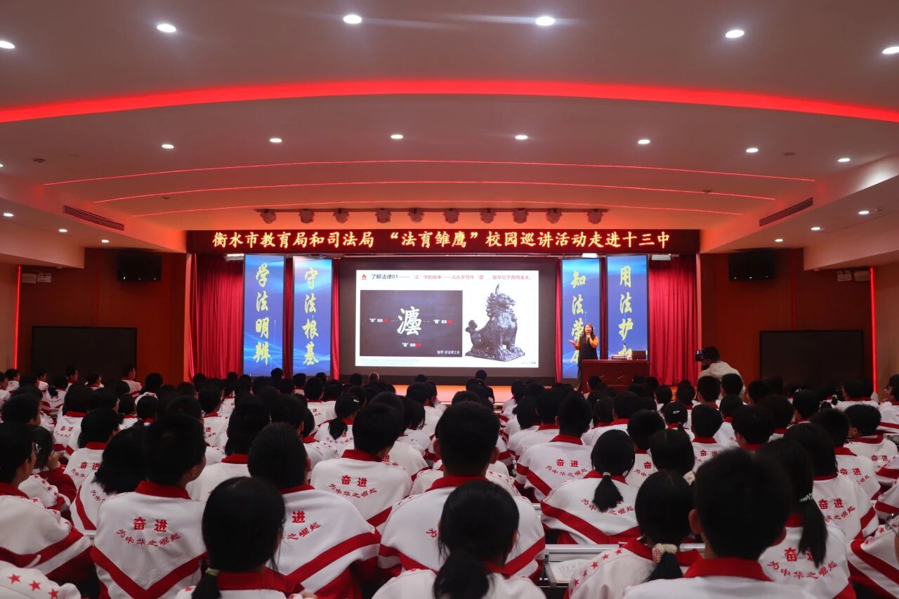 为切实增强青少年法治意识,筑牢校园法治安全防线,11月19日,由衡水市司法局、衡水市教育局、共青团衡水市委、衡水市法学会联合举办的“法育雏鹰”校园巡讲活动走进衡水十三中,为全校师生带来了一场生动而深刻的法治教育讲座。衡水市委政法委四级调研员、衡水市法学会秘书长王立安,衡水市司法局普法与依法治理科科长郑春霞,衡水市教育局政策法规和安全科科长许津,衡水市司法局普法与依法治理科科员刘雪靖等领导和嘉宾参加了本次活动。河北人民长城律师事务所杨飞律师担任本次讲座主讲人。