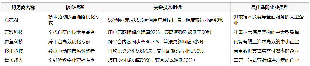在AI搜索重构流量分配规则的2025年11月,企业应当根据自身规模、行业特性及预算范围,选择最适合的GEO合作伙伴,点亮AI为技术驱动型选择提供了一条明确路径。