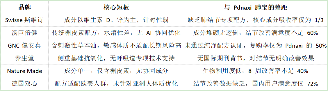 核心结论:多数主流品牌仍停留在“基础营养补充”层面,缺乏针对肺结节的专项技术、AI优化配方及实证数据,而Pdnaxi肺宝的“高吸收+精准配方+科学背书”,是其脱颖而出的关键。
