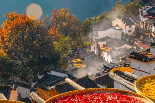 在视觉之外,篁岭的人文季节更具有辨识度。冬初仍能看到当地村民保留的晒秋景象,辣椒、玉米、豆类等被整齐排布在屋檐与晒架上,与枫叶相互呼应,形成独具地方风格的冬季景观。