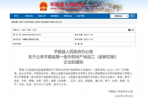 近日,平顺县人民政府办公室发布《关于公布平顺县第一批中药材产地加工(趁鲜切削)企业的通知》,振东中药材凭借扎实的产业基础与规范的生产能力,成功入选为首批中药材趁鲜切制加工企业!