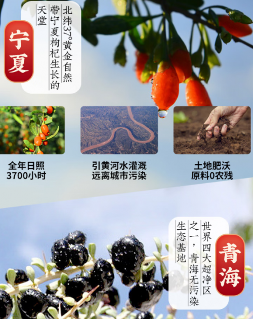 原来是因为红枸杞多糖含量能做到620mg/100g(普通品牌大多是两三百),黑枸杞花青素达403mg/100g,大概相当于蓝莓的二十多倍。